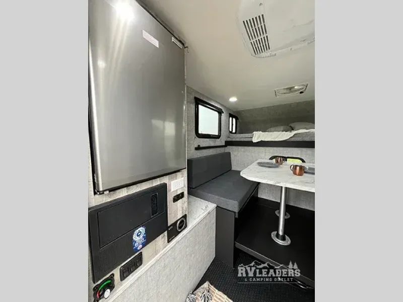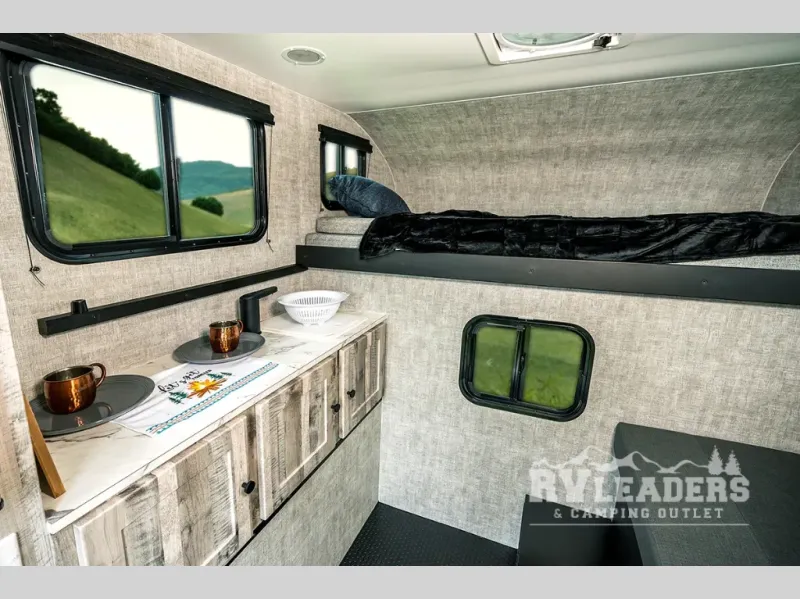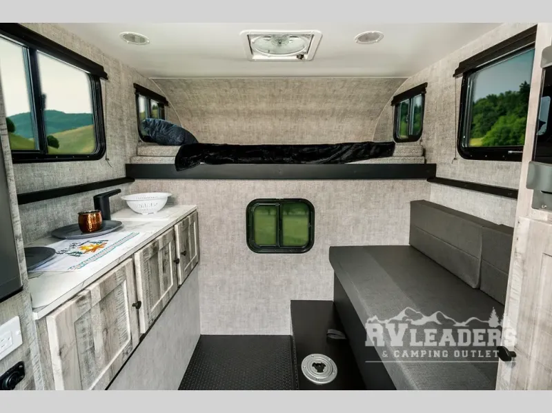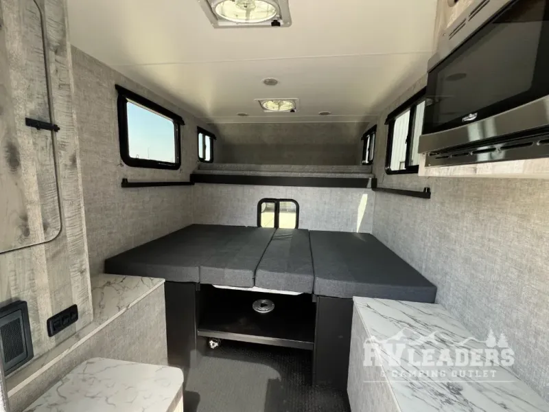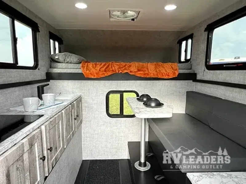 Experience the ultimate in adventure and flexibility with our truck camper. The kitchen area features a refrigerator that offers great storage for your favorite fruits and vegetables, keeping them fresh and ready to eat. There is also a sink and portable cooktop, making meal prep easy on the go. Also, the ample storage keeps your gear organized. The two-person dinette bench seat and removable table provide a cozy spot for meals and relaxation. The 45” x 80” bunk offers a comfortable sleeping area at night, with the 80” x 81” pull-out North/South bed providing additional sleeping space.