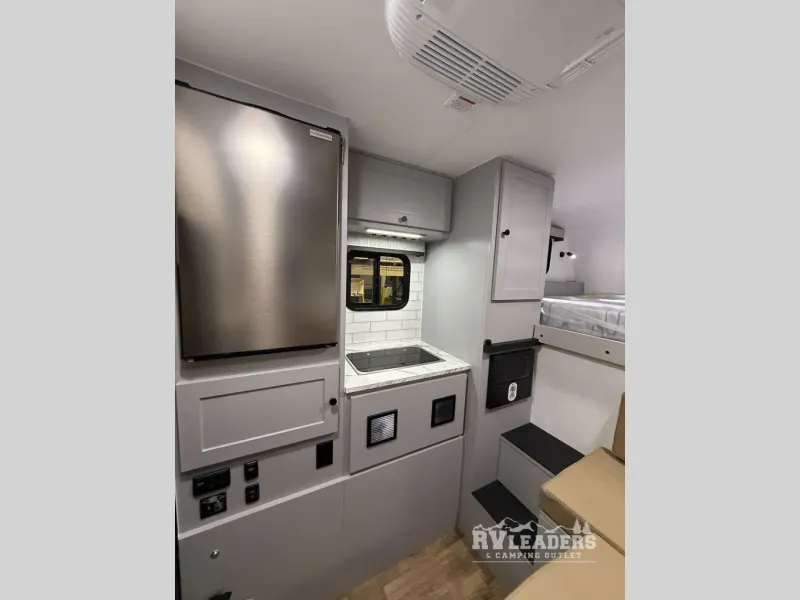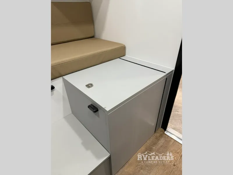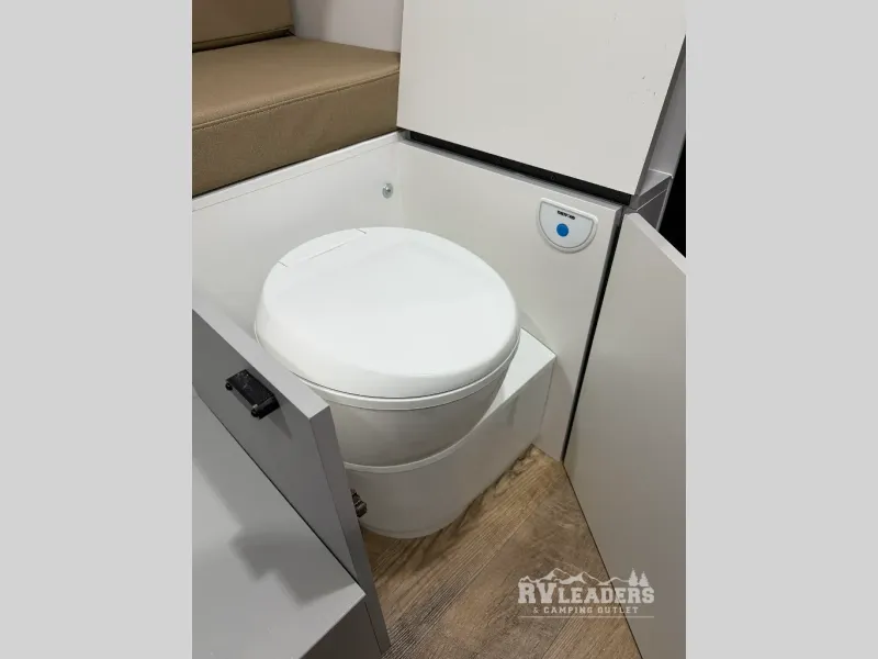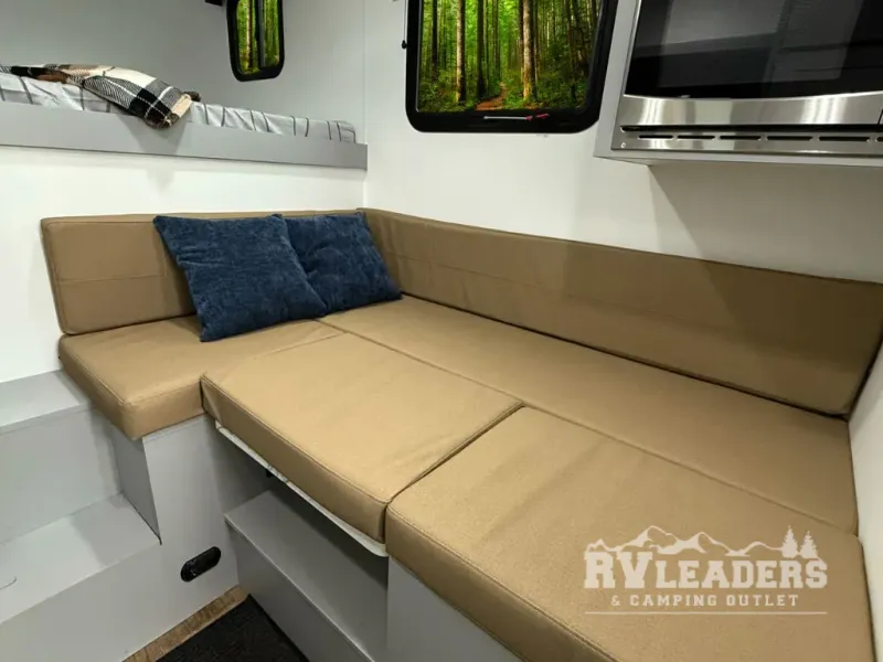 The interior of the AQUILA 6.5 is surprisingly spacious, featuring a roomy main living area highlighted by a large u-shaped dinette which quickly converts to a secondary sleeping area and houses a built-in cassette toilet; a queen bed in the cabover; LP furnace; a kitchen featuring a LP cooktop; sink; 12V refrigerator; and loads of storage; 200W roof solar panel; 100A lithium battery (Bluetooth heated); MaxxAire fan with rain sensor and remote; exterior shower connection with hot and cold; and more.
