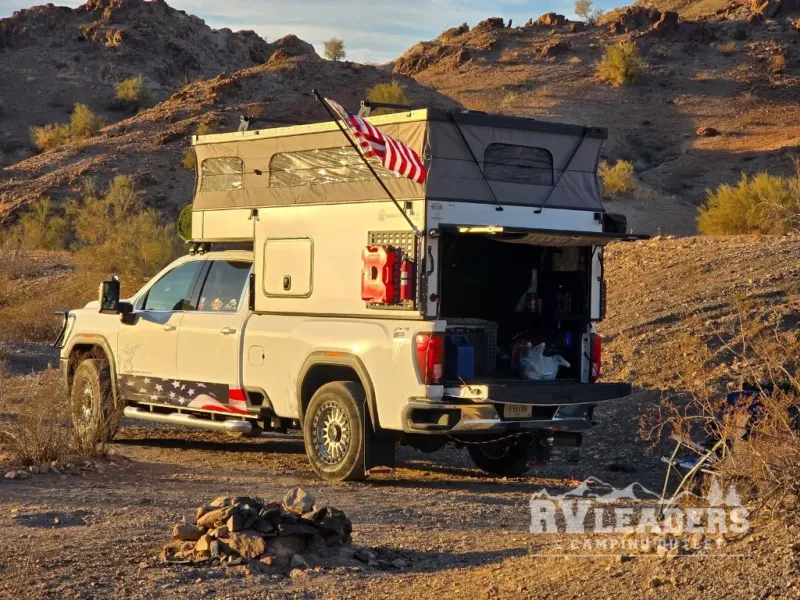 This is the perfect truck topper camper for an 8' bed! After you have been driving all day, you can find a campground to rest at for the night. The strut-assisted roof top features a water-resistant tent with integrated windows and screens and will provide more interior space to relax on the 78" x 74" bed. There is also convenient under-bed storage here for your belongings and camp gear. In the morning you can use the camp's shower to freshen up before using the optional portable Blackstone griddle to make breakfast, then head out for the day to hike, fish, or hunt!
