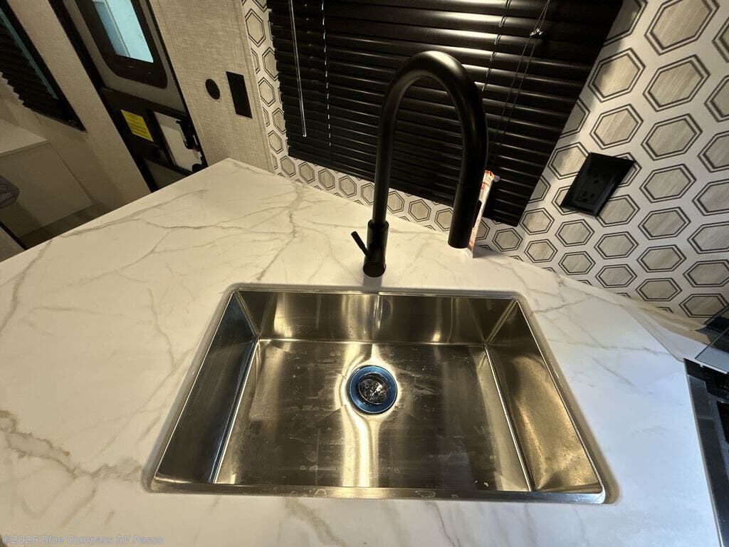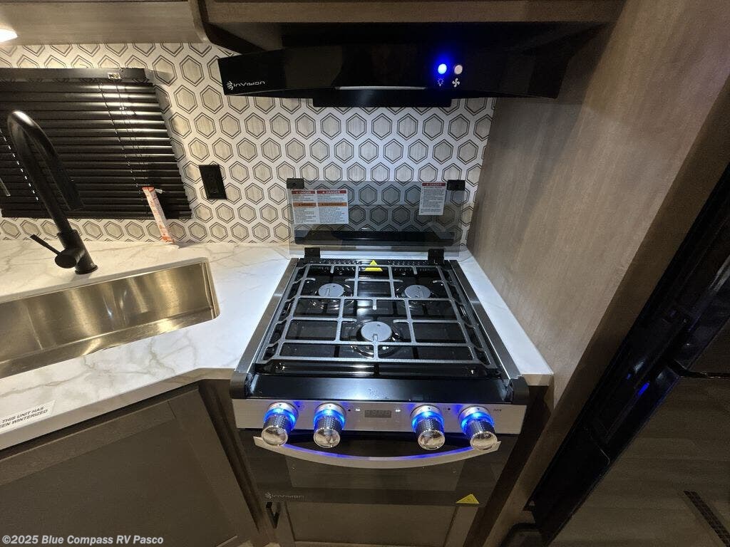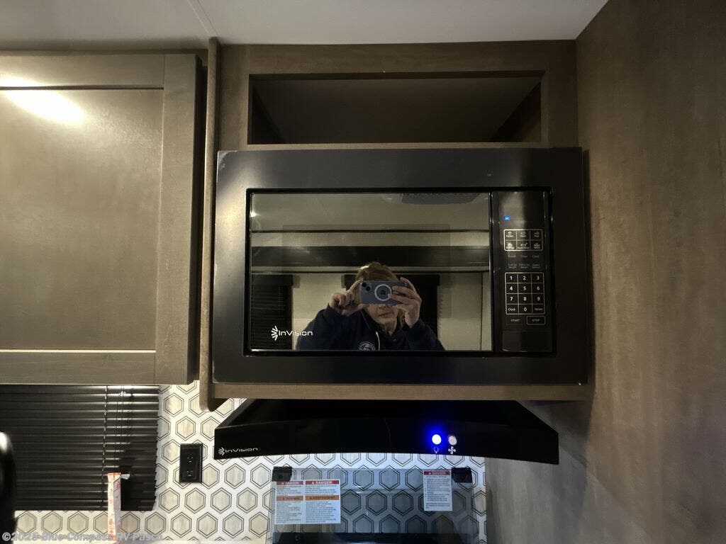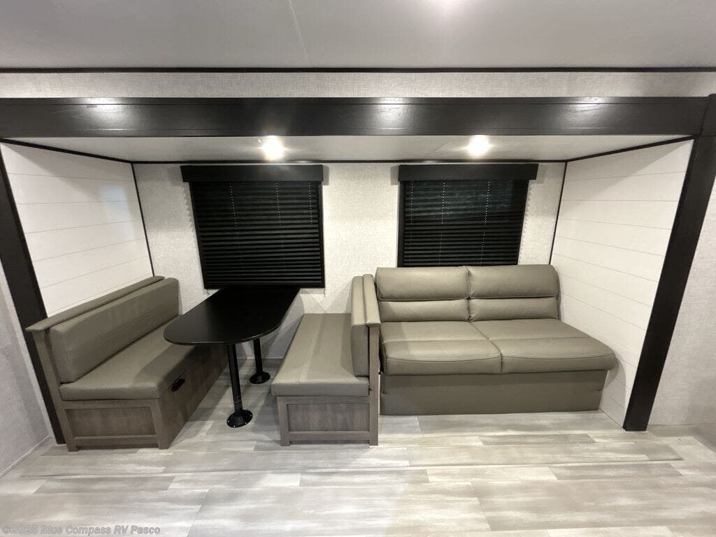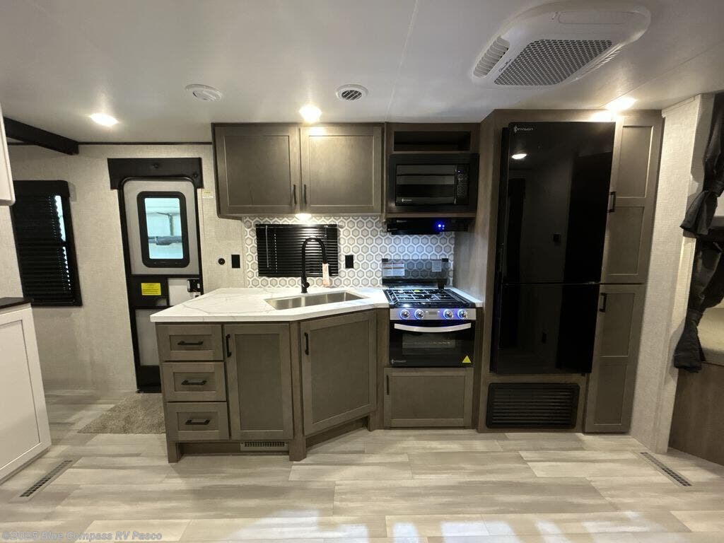 Enjoy camping at local RV spots or even national parks in this dual axle trailer that offers a large slide with a jackknife sofa and booth dinette. There is a full bathroom to get cleaned up in with extra counter space for toiletries, and the kitchen provides a three burner range with glass cover, a 17" oven and a pantry to hold all the goodies. You can enter the front bedroom from each side of the entertainment center giving you your own side, and there are dual wardrobes plus a shelf overhead. And don't forget about the 16' power awning with LED lighting, the exterior storage for your outdoor gear and the outside kitchen including an outdoor griddle and a refrigerator. You might even like to add a few options, take a look at the list!