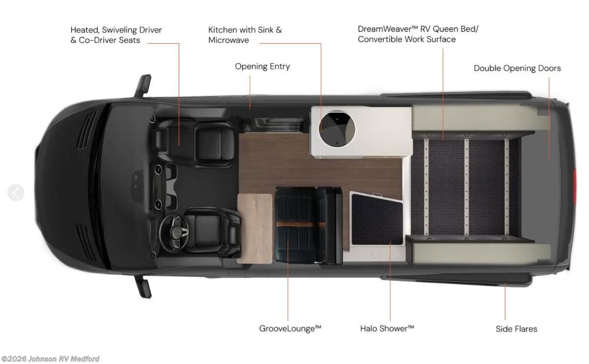 Features Include: 144-inch Wheelbase, Auxiliary Alternator, No Rub Fender Kit, Active Brake Assist, Rain Sensor, Running Boards, Owl Vans Side Steps, Swivel Heated Seats, Satellite Radio, Entry Assist Handle, 4-Seatbelts, Privacy Shades, Stainless Steel Sink, Folding Faucet, Refrigerator Freezer, STOlink Power Plug, Six Indoor USB Ports, 2-Beds, RV Twin Bed, Low-Mount Solar Port, 100w Solar Panel, Roof AC System, Hood Spoiler, nVader Rear Rack, nVader Ladder