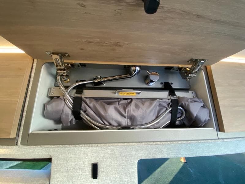 You'll love the stealthy exterior of the Dark MODE OG! The GrooveLounge can seat two adults and can convert to a couch or bed, plus you'll have Dreamweaver bed that easily folds up to reveal a workspace. You can whip up your best meals with the portable induction cooktop and stainless-steel microwave, and the refrigerator/freezer will keep cold items fresh. There is also a stainless-steel sink with a folding faucet and an exterior fold-down table if you want to get some fresh air as you prep dinner. You'll appreciate the Halo shower with a FlexSpace concealed shower pan, along with a portable toilet and hot water recirculation system.