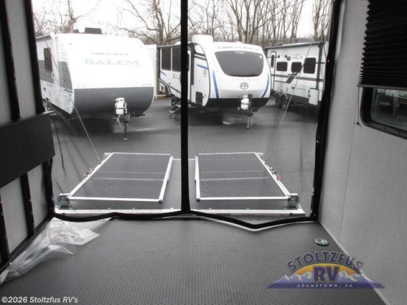 Get ready for a great camping experience where you can take along your favorite ride-on toys, kayaks, or other items that you may not normally have room to load as this toy hauler features a 6' 9" cargo width and 10' 11" cargo length. Once unloaded, set up with the rear bed that will make for a great night's rest. The front of this unit is shared with the wet bath and kitchen. Here, you can make meals on the two burner stove or in the microwave oven, and there is a refrigerator for perishables. This unit also includes the Rush Toy Hauler Package with a ramp door, dual cargo loading lights, a magnetic rear bug screen, and four D-rings to secure your toys.