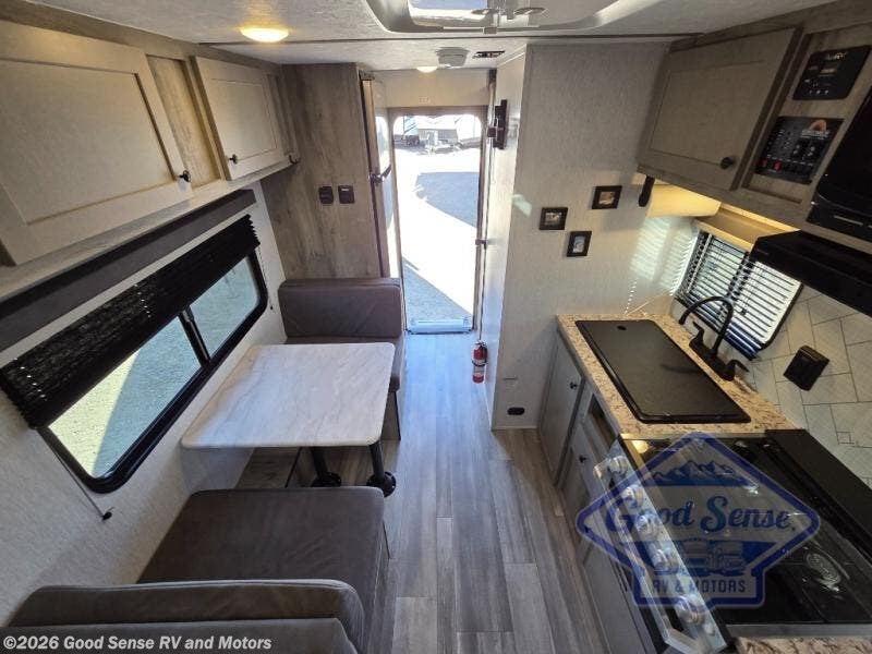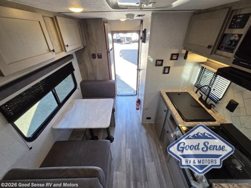 This travel trailer is perfect for couples who want to getaway together! The front bed offers a comfortable place to lay your head at night. When you're not using the booth dinette to enjoy a meal that you prepared with the two burner cooktop or playing a card game, you can transform it into an extra sleeping space. You can start your mornings feeling clean and fresh after showering in the tub with unwanted steam removed with the power roof vent.