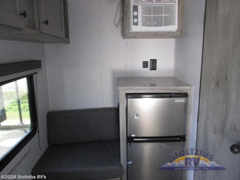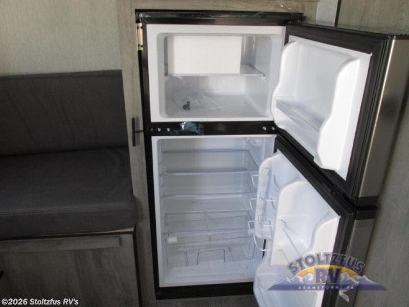 This lightweight travel trailer is perfect for two to three campers each night! You will sleep soundly on the front 54" x 74" bed with an overhead shelf and a closet for your things. Whip up eggs and bacon on the two burner cooktop in the morning, then dine at the 30" booth dinette. This can also double as sleeping space for an overnight guest or two little ones! The private bath with a 24" x 32" shower and a toilet will let you freshen up each day, and the double sink in the kitchen provides a place to wash your hands and teeth at night. You will also appreciate having a 4.3 cu. ft. 12V refrigerator to keep your food fresh and a 5K BTU wall A/C to keep you comfortable all summer long!
