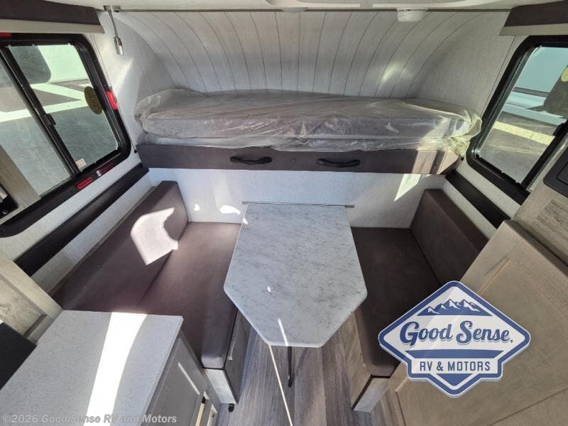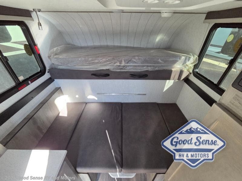 This truck camper is simple and to the point! You'll have somewhere to rest your head each night thanks to the front bed and booth dinette that will double as both seating and sleeping space. Once you've made dinner on your own outdoor grill, you can wash up using the indoor sink, and there is counter space here also. You'll appreciate the added safety features that include a smoke detector, fire extinguisher, and a C/O detector.