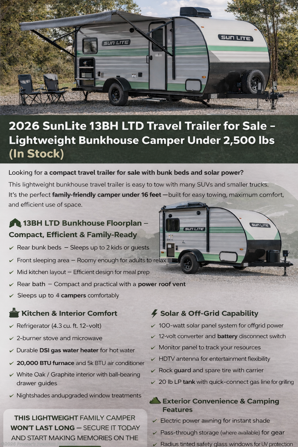 If you are searching for a lightweight travel trailer for sale with bunk beds and solar capability, this 2026 SunLite LTD 13BH is a perfect fit. In stock now at Prosser’s Premium RV Outlet, this compact bunkhouse camper is designed for easy towing, simple setup, and real-world family camping.