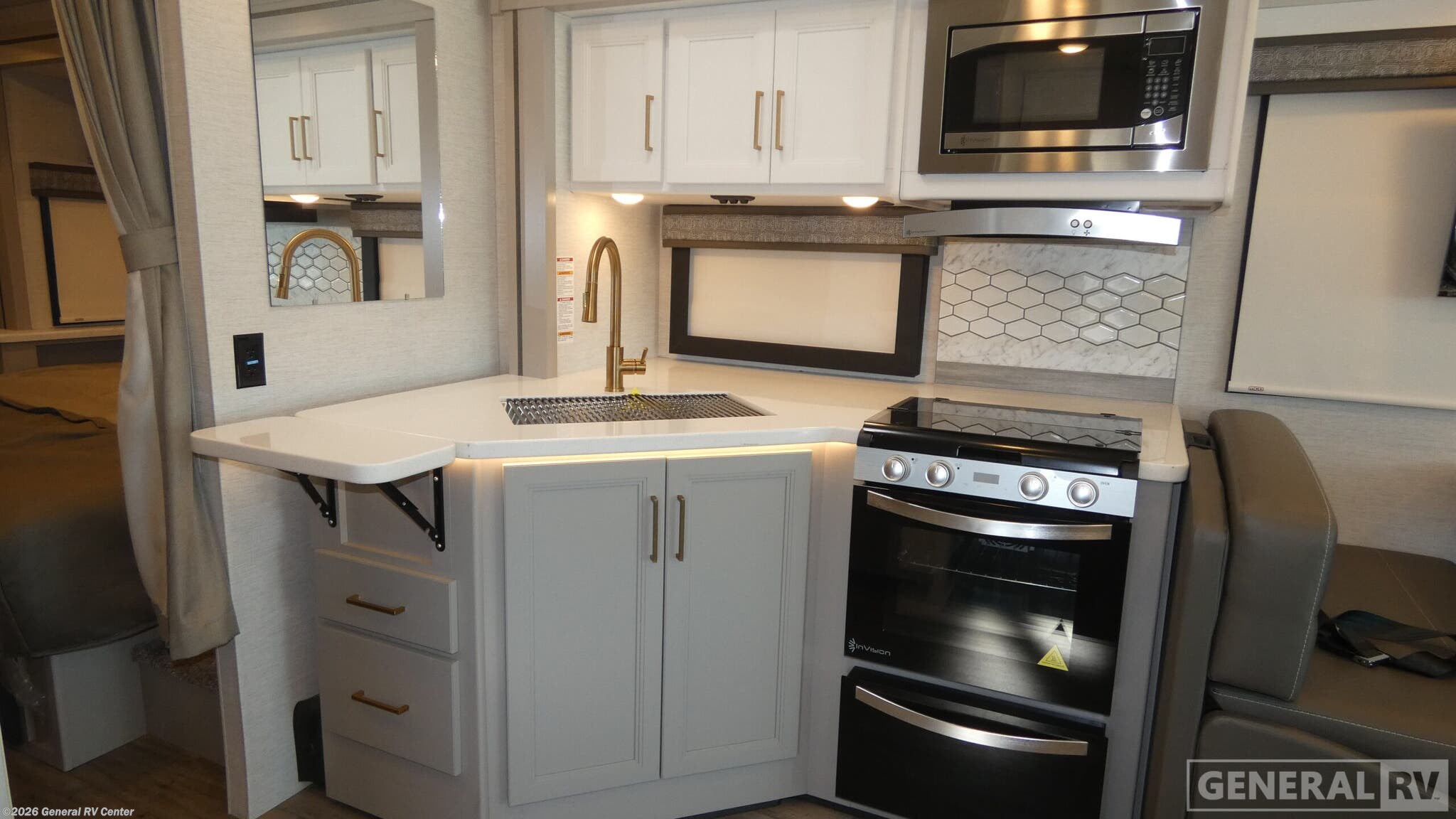Step into the world of luxury and adventure with the 2026 Thor Motor Coach A.C.E. 29G. This motorhome is designed to be your home away from home, offering a spacious and comfortable environment for up to eight guests. The centerpiece of this RV is the king-sized bed, perfect for a restful night's sleep after a day of exploration. With two convertible sleeping areas, everyone can enjoy their own cozy space. The center kitchen, equipped with a three-burner cooktop and a mid-size refrigerator, ensures you can whip up delicious meals on the go. The front living area, complete with a jack-knife sofa and dream dinette, provides ample room for relaxation and entertainment. The A.C.E. 29G's thoughtful design extends to its exterior, featuring a 19 ft. powered retractable awning for shaded outdoor enjoyment. With a robust Ford F53 chassis, 350 horsepower, and 8,000 lbs. of towing capacity, this RV is built for the road. The rear bath offers convenience and privacy, while the automatic heater keeps the interior cozy. Whether you're embarking on a cross-country journey or a weekend getaway, the Thor Motor Coach A.C.E. 29G ensures you travel in style and comfort. For more information or to experience this incredible RV in person, visit your nearest General RV dealership.