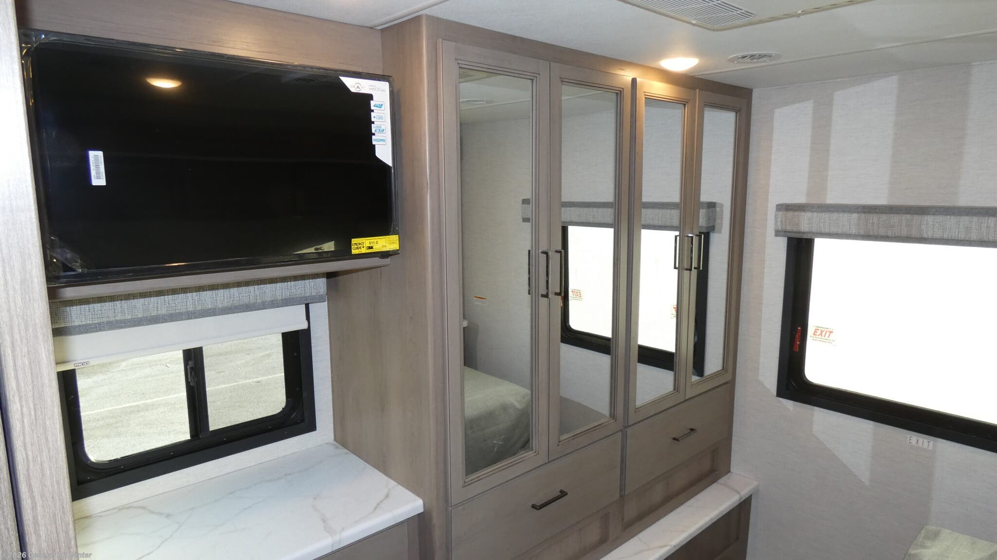 Thor Motor Coach A.C.E Class A gas motorhome 30C highlights: Rear Private Bedroom Full Bath Three Burner Cooktop Pet-Link Multi-Purpose Tie-Down Exterior 32" TV This double slide out coach will feel a little more like home since it features a rear private bedroom with a king bed slide out, your own 32" TV, and a large closet for your things. Your guests can sleep on the drop-down overhead bunk, the Dream Dinette, or the jack-knife sofa, and there is a 40" TV in the living area if they want to watch a movie at night. This A.C.E has a fully-equipped indoor kitchen, plus an exterior kitchen the chef is sure to love, and of course a full bath is on board, making your adventures easier than ever! The A.C.E Class A gas motorhome is constructed with a welded tubular steel floor, vacu-bond laminated roof, walls and floor with block foam insulation, and a premium one-piece exterior roof for a coach made to last. You will love the pet-friendly features, like the Pet-Link multi-purpose tie-down and the Pull-Out Kibble Station with an FDS approved pet bowl liner. Each model includes an Onan RV QG 4,000 gas generator, a Winegard ConnecT Wi-Fi extender +4G, and are pre-wired for solar charging. Some of the other convenient amenities you will find on the A.C.E are framed windows, a basement pass-through storage, and an exterior LP connection. Head inside to find residential vinyl flooring, pressed laminate countertops, glass tile backsplash in the kitchen, and a wireless phone charger!