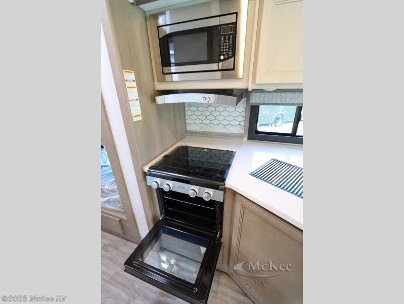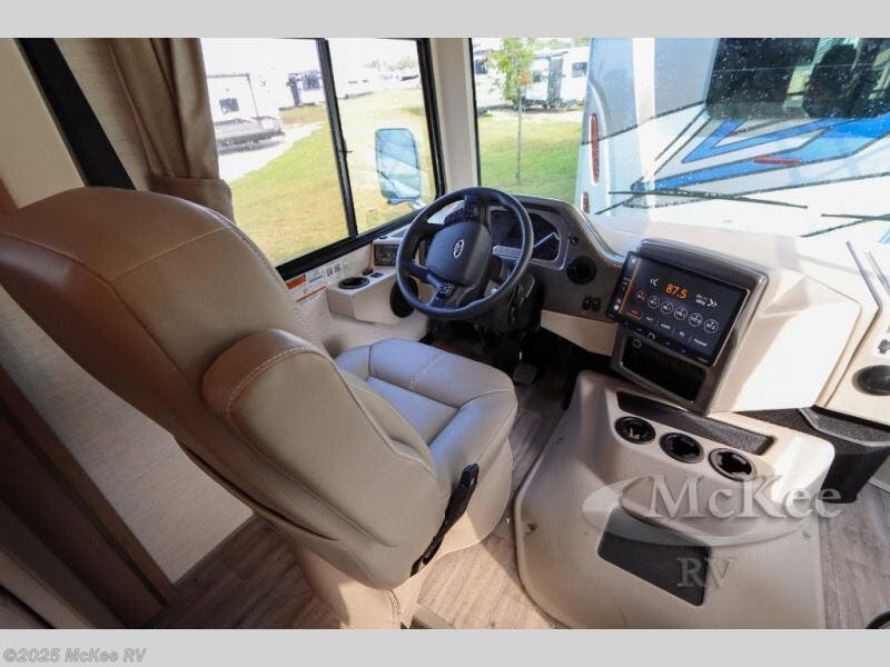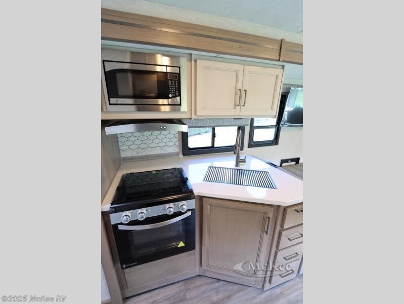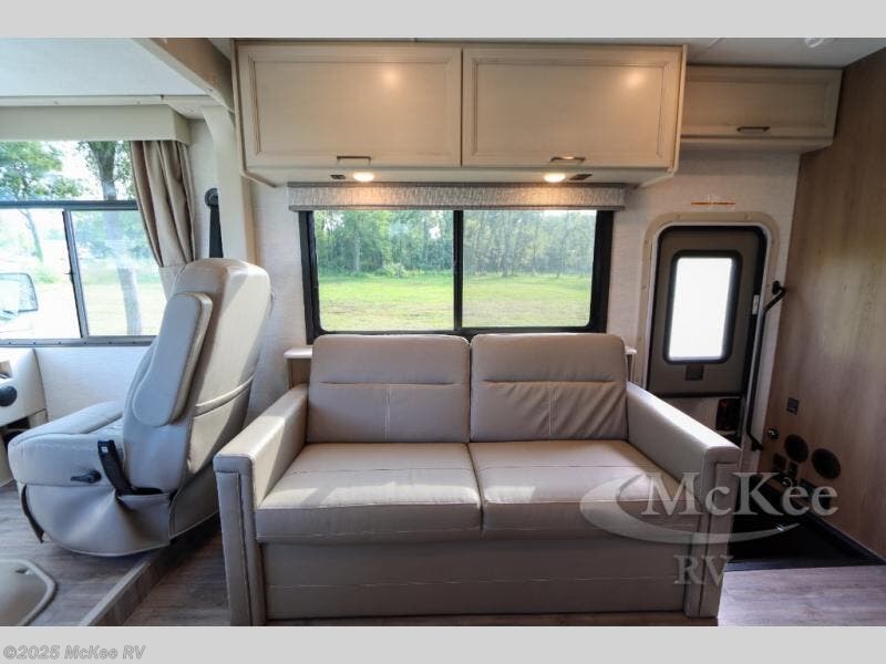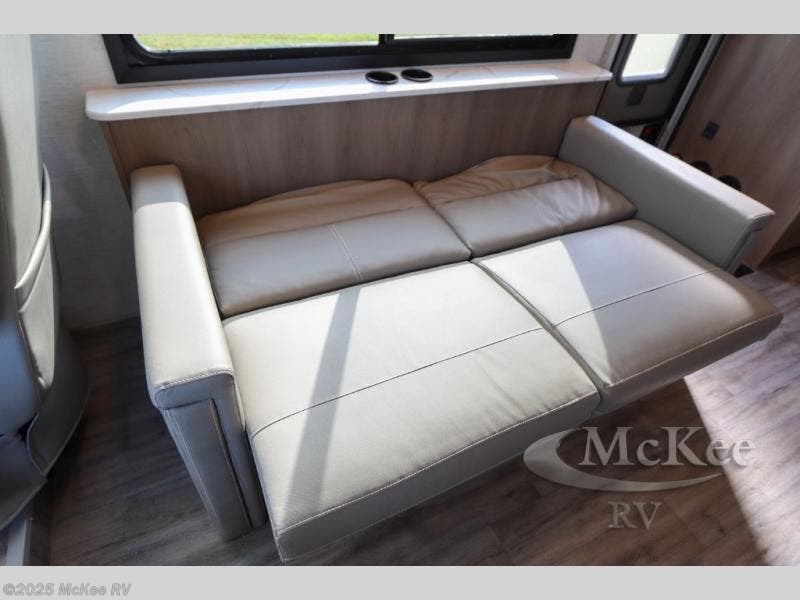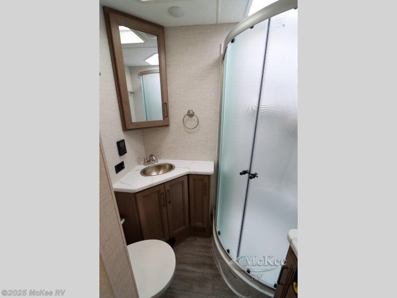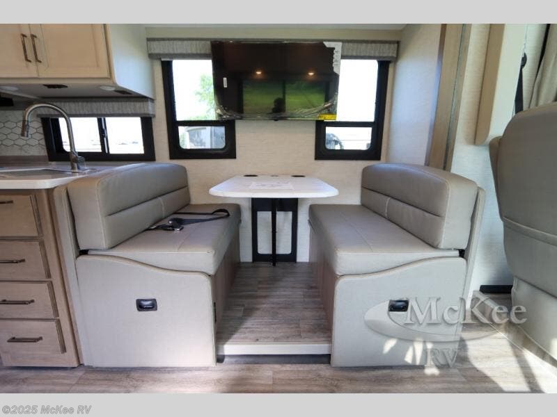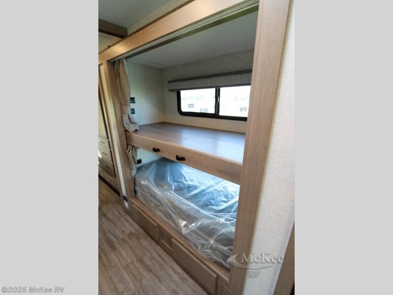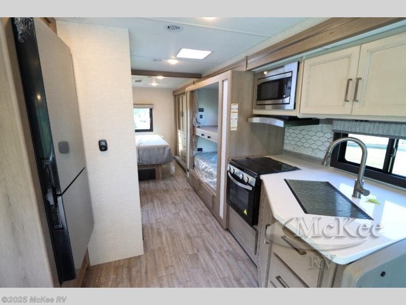 Are you looking for a motorhome with more space and comfort? Your search is over with this family-friendly coach that can sleep eight people each night. The kids will love the bunk beds and the drop-down overhead bunk up front, while you enjoy the king bed in the rear bedroom. There is also a Dream Dinette and a jack-knife sofa across from the 40" TV for easy viewing. Home-cooked meals can be prepared on the three burner gas cooktop or in the microwave oven, and leftovers can go in the 12V DC double door refrigerator. This model also includes a spacious full bath with a linen closet, a shower skylight, and a sleek glass shower door!