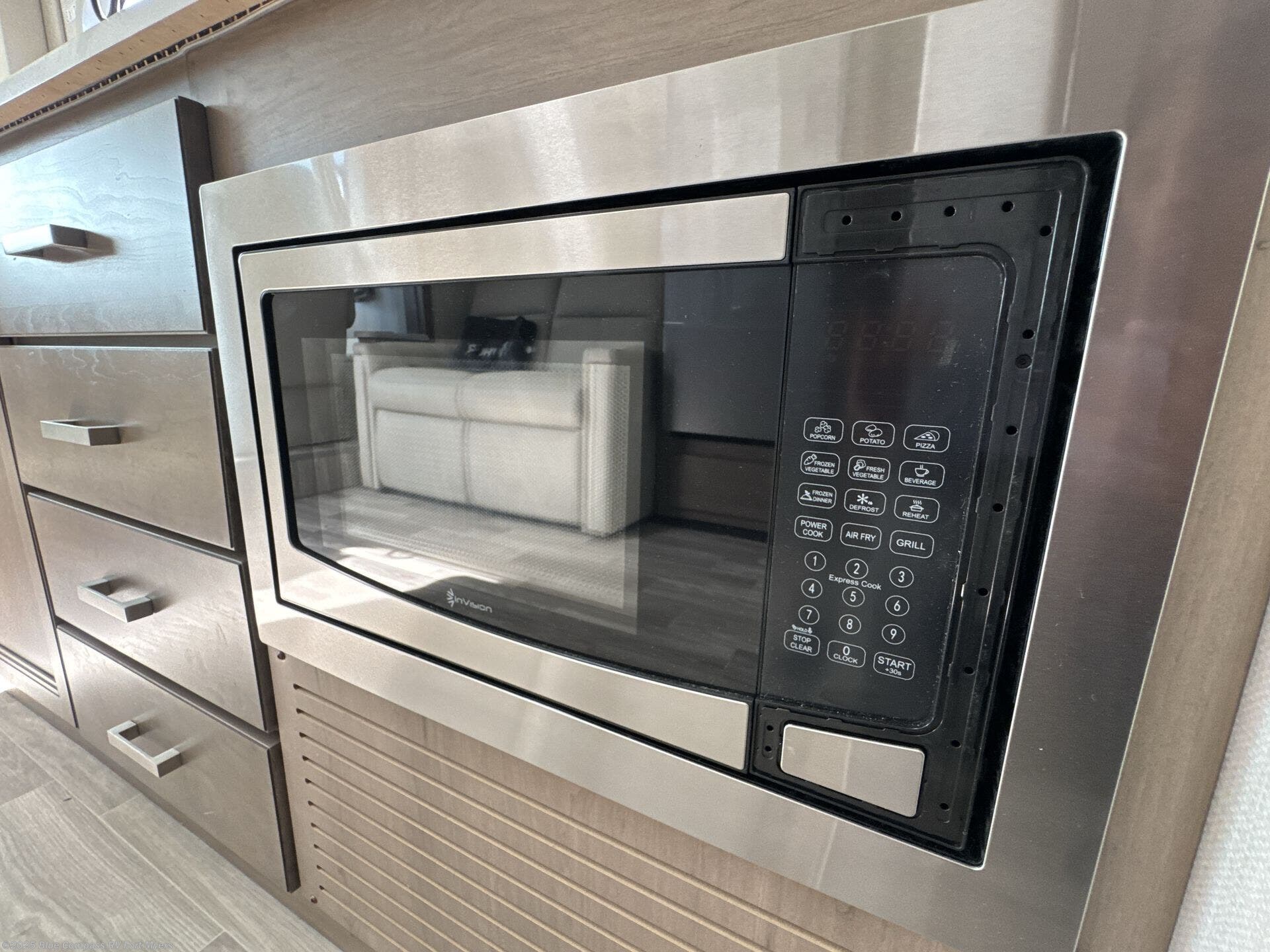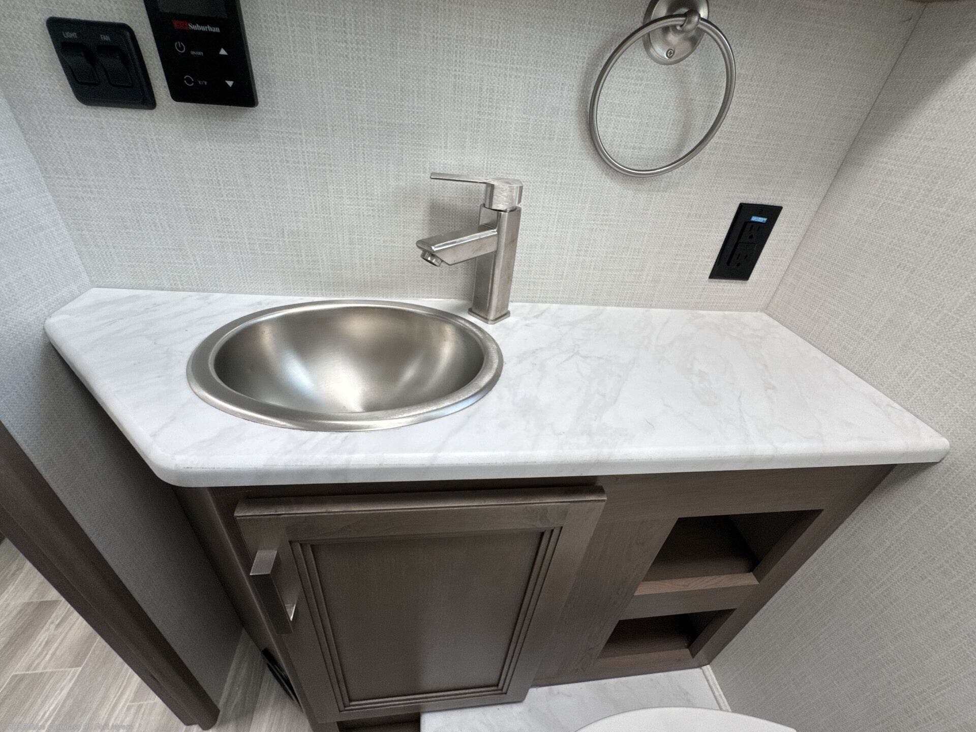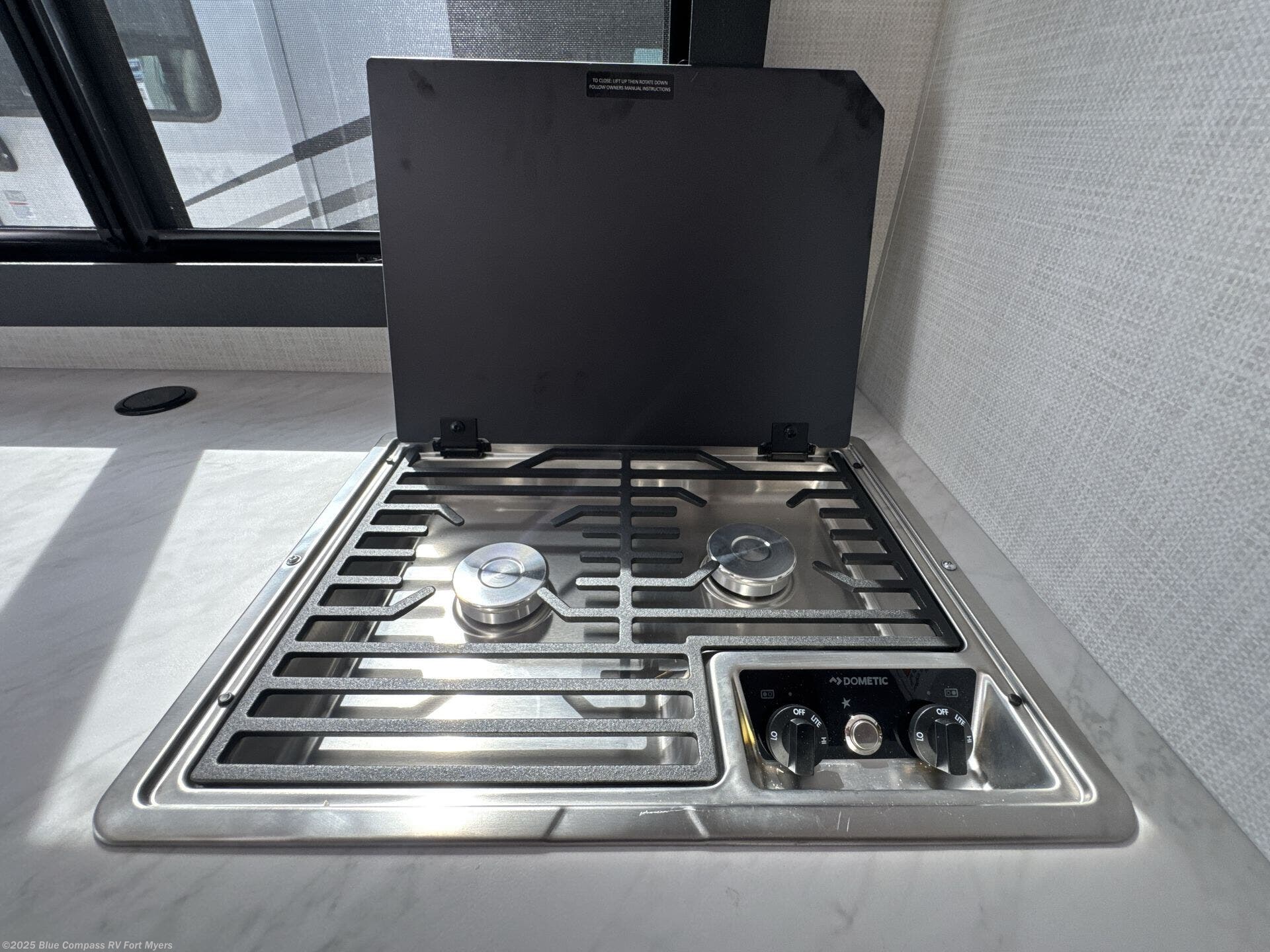 This is a perfect couples coach! After you've arrived at your destination and set up camp, prepare lunch with the two burner gas cooktop or in the convection microwave with an air fryer. You'll also find a 12V double door refrigerator for perishables, plus a single bowl sink with a pull-down sprayer and a waste basket for easy clean up. The theater seating slide has a direct view of the 32" Smart TV, and there is a coffee table up front between the swivel captain's chairs for even more seating space. When you're ready for some shut-eye, the rear bedroom with an RV queen bed will provide a great night's rest, and you'll appreciate closets on either side of the bed for your clothes, and even a 32" Smart TV for movie night!
