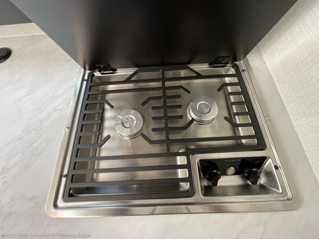 This is a perfect couples coach! After you've arrived at your destination and set up camp, prepare lunch with the two burner gas cooktop or in the convection microwave with an air fryer. You'll also find a 12V double door refrigerator for perishables, plus a single bowl sink with a pull-down sprayer and a waste basket for easy clean up. The theater seating slide has a direct view of the 32" Smart TV, and there is a coffee table up front between the swivel captain's chairs for even more seating space. When you're ready for some shut-eye, the rear bedroom with an RV queen bed will provide a great night's rest, and you'll appreciate closets on either side of the bed for your clothes, and even a 32" Smart TV for movie night!