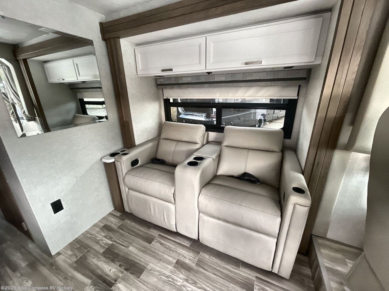 Wherever you decide to roam, you can be sure to make the most out of each trip in this coach! The swivel captain's seats can be turned to face the main living room once you park, and there is additional seating space on the theater seating. There is even a 32" Smart TV across from the sofa to enjoy movies! It will be so easy to make meals with a two burner gas cooktop and convection microwave with an air fryer, plus there is a 12V double door refrigerator for cold items. A full bath will let you freshen up after a day of exploring, and the rear bedroom with a privacy curtain is sure to bring comfort. Here, you'll enjoy twin beds with a king bed conversion, a USB power charging center for your electronics, and a 32" Smart TV so you can watch shows in bed!