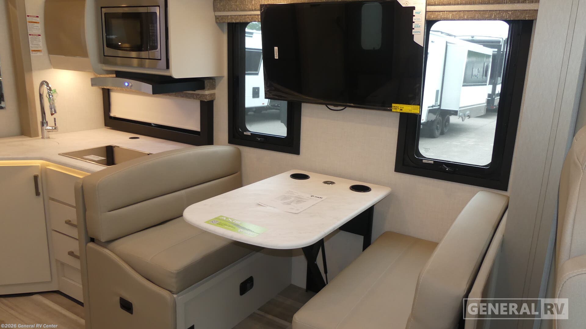 **2026 Thor Motor Coach Axis 28.1 Highlights:** - Full-Wall Slide for Expanded Living Space - Power Drop-Down Overhead Bunk - Residential Kitchen with Convection Microwave & 12V Refrigerator - 20' Power Awning with Integrated LED Lighting - Tankless Water Heater & 15,000 BTU A/C Hit the road with confidence in the 2026 Thor Motor Coach Axis 28.1, a compact Class A RUV designed to drive like an SUV but live like a full-featured motorhome. The full-wall slide dramatically opens the interior, making room for comfortable theater seating or a sofa (depending on build), a spacious Dream Dinette, and a 32" Smart TV for easy relaxation. A power drop-down overhead bunk adds sleeping flexibility, while the cockpit’s 14" touchscreen with Apple CarPlay and Android Auto keeps navigation simple and modern on every trip. The kitchen includes a two-burner cooktop, convection microwave, and 12V refrigerator, giving you all the essentials for meals on the go. At the rear, the Axis features an inviting RV queen bed with bedroom TV and convenient closets, while the mid-ship bathroom provides a 24" x 36" shower and everything you need to refresh after a full day of adventure. Outside, the 20' power awning with LED lighting creates a perfect shaded space for relaxing at your campsite. With its tankless water heater, strong Ford 7.3L V8 engine, and generous storage throughout, the Axis 28.1 offers big-coach comfort in a nimble, easy-to-drive package—ideal for couples or small families seeking flexibility and fun on the open road.