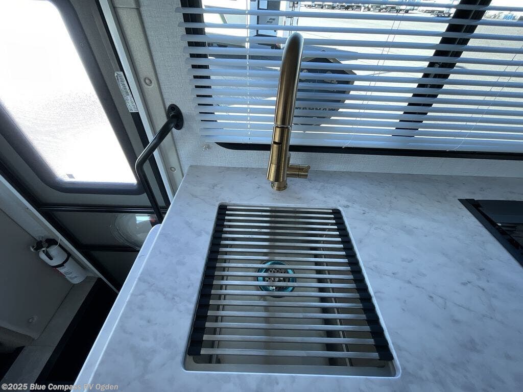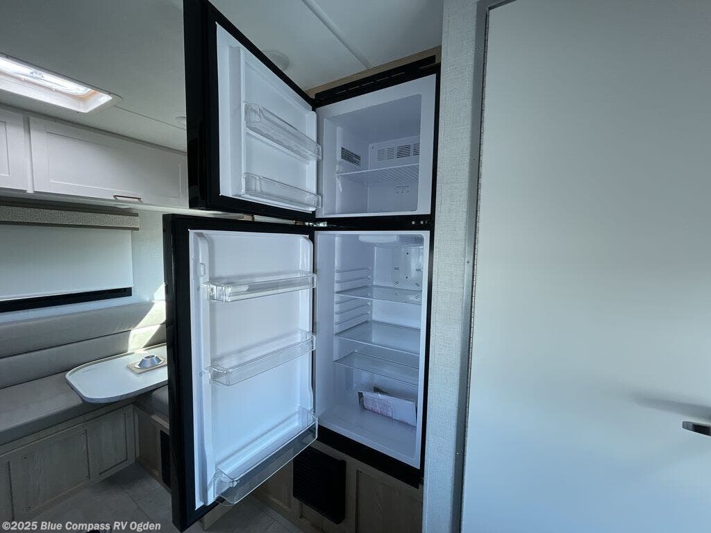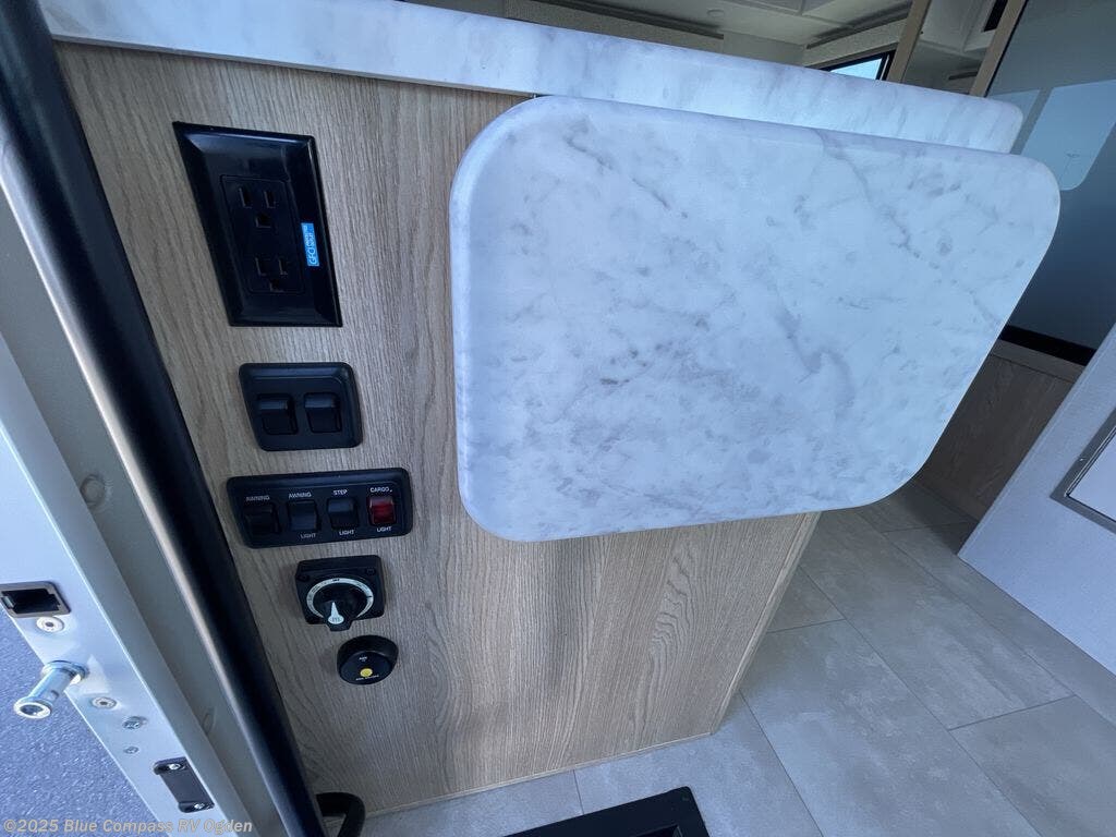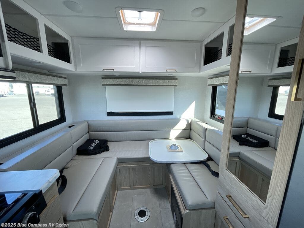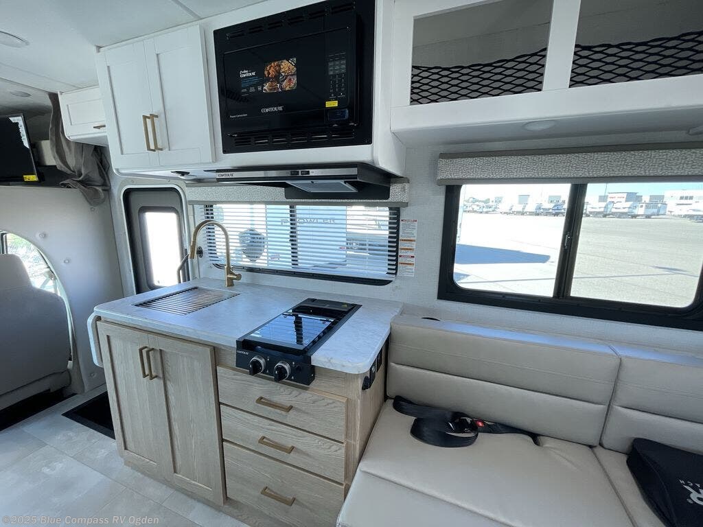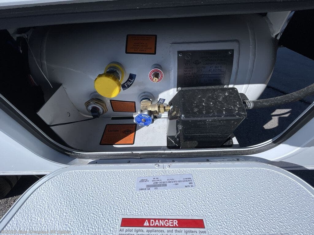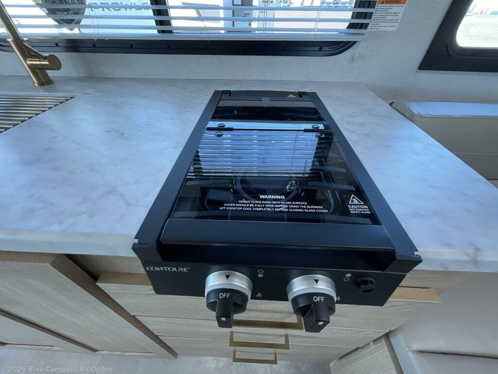 This compact, yet cozy coach is perfect for trips to the campground each weekend! Once you've reached your destination, you can set up the 11' power awning, unload the exterior storage compartments, and relax in your camp chairs. The two burner gas cooktop and convection microwave with an air fryer will let you make meals each day, and there is a 12V refrigerator to keep food fresh. A flip-up counter is another great feature that will give you more prep space! You can freshen up in the wet bath, grab your night clothes from the closet, then convert the U-shaped dinette into a 54" x 77" bed for a great night's rest!