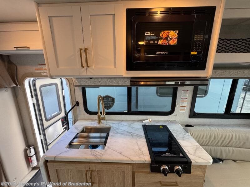 This compact, yet cozy coach is perfect for trips to the campground each weekend! Once you've reached your destination, you can set up the 11' power awning, unload the exterior storage compartments, and relax in your camp chairs. The two burner gas cooktop and convection microwave with an air fryer will let you make meals each day, and there is a 12V refrigerator to keep food fresh. A flip-up counter is another great feature that will give you more prep space! You can freshen up in the wet bath, grab your night clothes from the closet, then convert the U-shaped dinette into a 54" x 77" bed for a great night's rest!