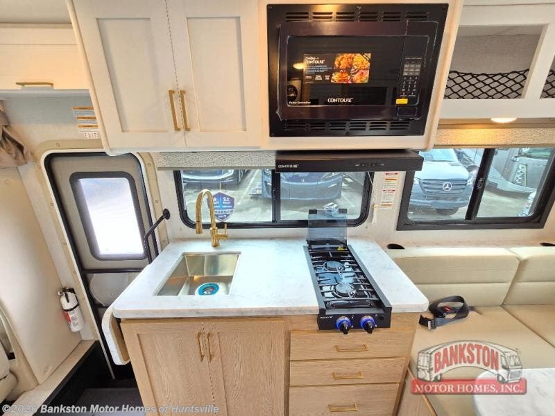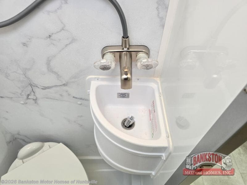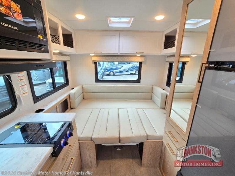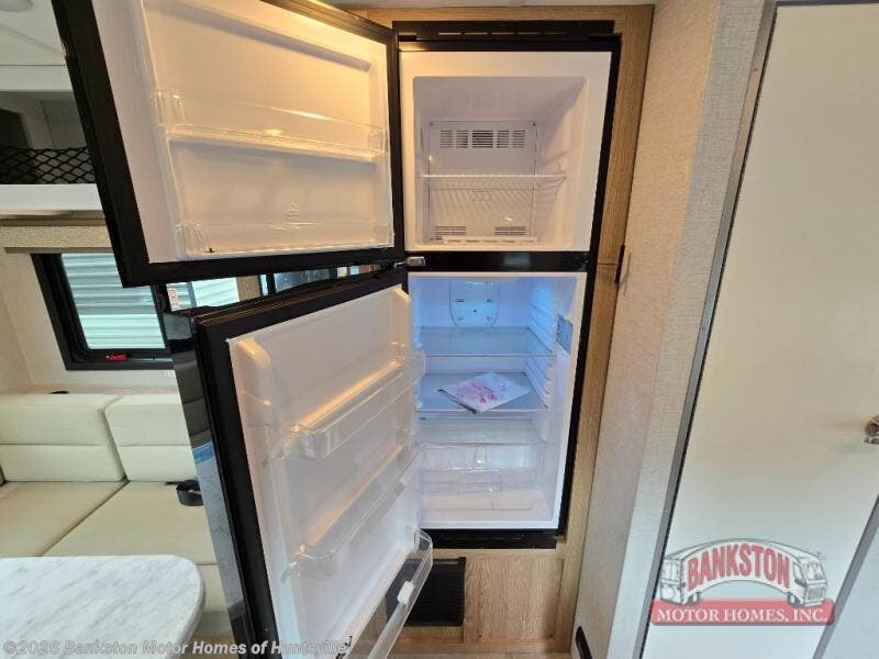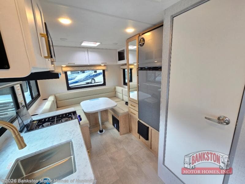 This compact, yet cozy coach is perfect for trips to the campground each weekend! Once you've reached your destination, you can set up the 11' power awning, unload the exterior storage compartments, and relax in your camp chairs. The two burner gas cooktop and convection microwave with an air fryer will let you make meals each day, and there is a 12V refrigerator to keep food fresh. A flip-up counter is another great feature that will give you more prep space! You can freshen up in the wet bath, grab your night clothes from the closet, then convert the U-shaped dinette into a 54" x 77" bed for a great night's rest!