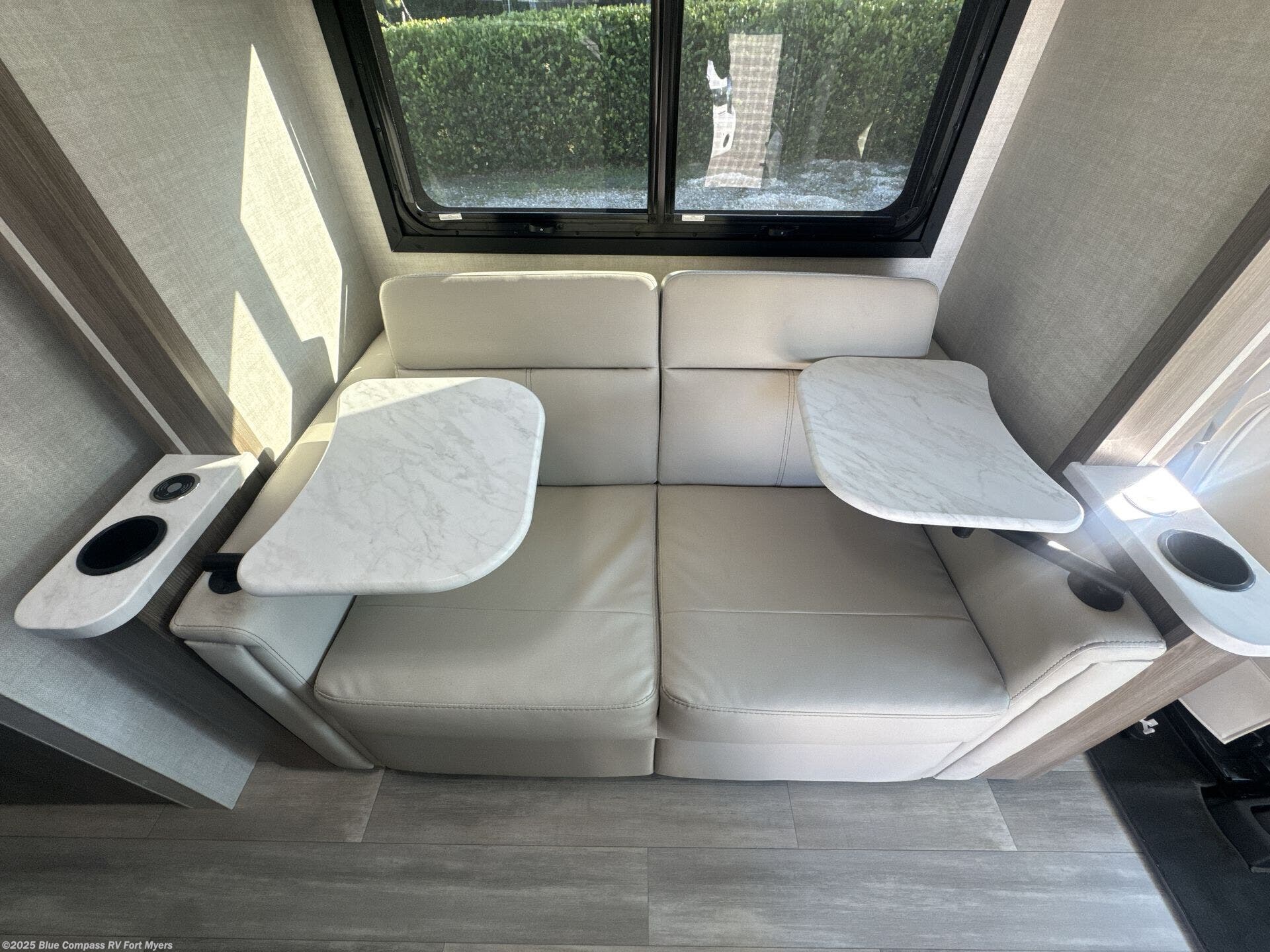 The perfect coach for two whether you are a couple or not! This Compass AWD model features a set of twin beds that can easily convert to a king bed if you like. Enjoy the added space thanks to a slide out jack-knife sofa. You will appreciate the kitchen amenities for light meals and snacks while on the road, plus the onboard bath offers a 27" x 27" radius shower, toilet, and sink which is convenient as well. There are also two 32" Smart TVs in this coach, one over the side entry opposite the seating in front, and one back in the sleeping area at the foot of the roadside twin bed. A built-in skylight offers the ability to stargaze in the front of the coach on a clear night.