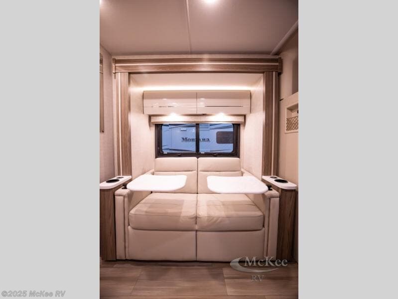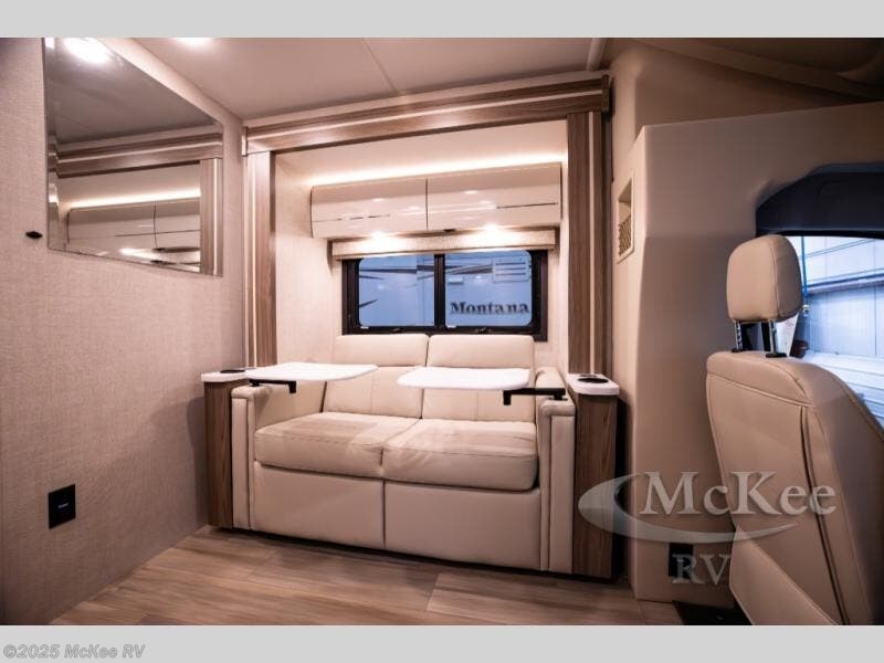 The perfect coach for two whether you are a couple or not! This Compass AWD model features a set of twin beds that can easily convert to a king bed if you like. Enjoy the added space thanks to a slide out jack-knife sofa. You will appreciate the kitchen amenities for light meals and snacks while on the road, plus the onboard bath offers a 27" x 27" radius shower, toilet, and sink which is convenient as well. There are also two 32" Smart TVs in this coach, one over the side entry opposite the seating in front, and one back in the sleeping area at the foot of the roadside twin bed. A built-in skylight offers the ability to stargaze in the front of the coach on a clear night.