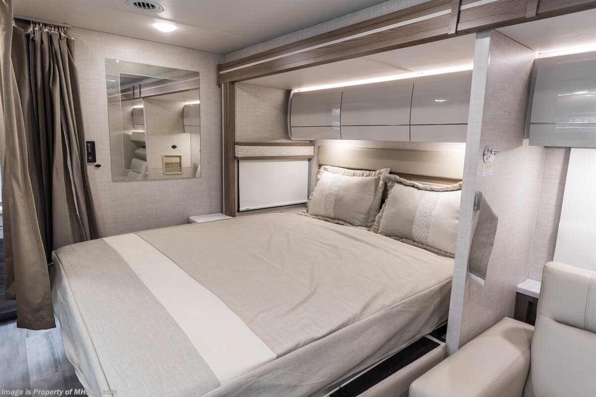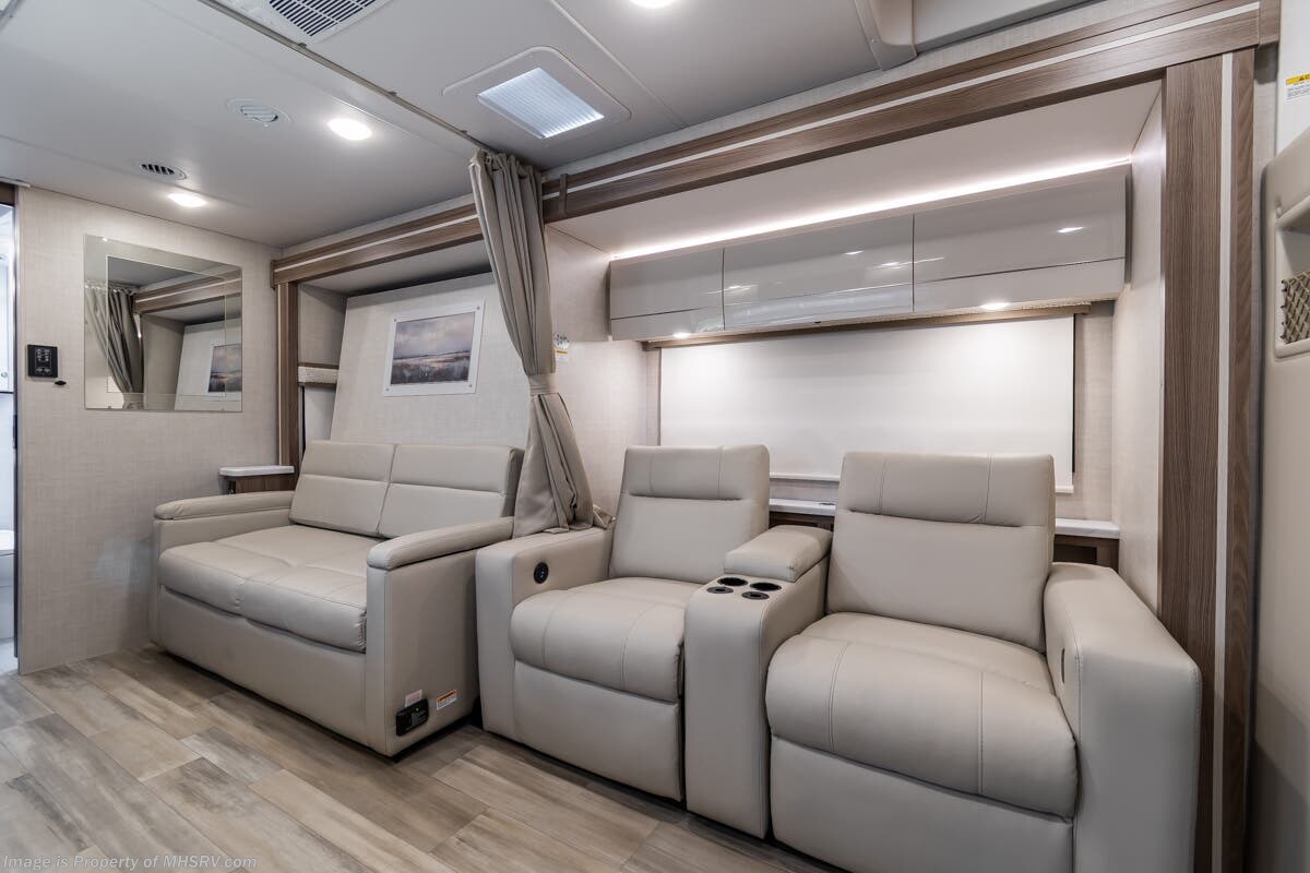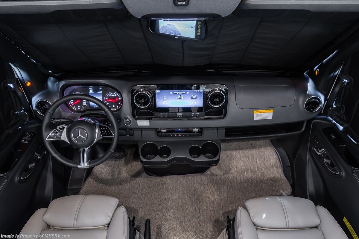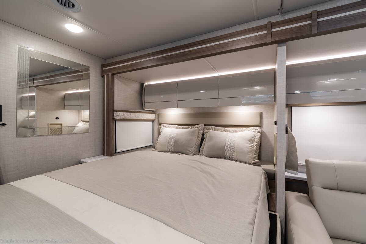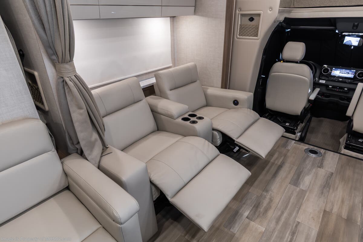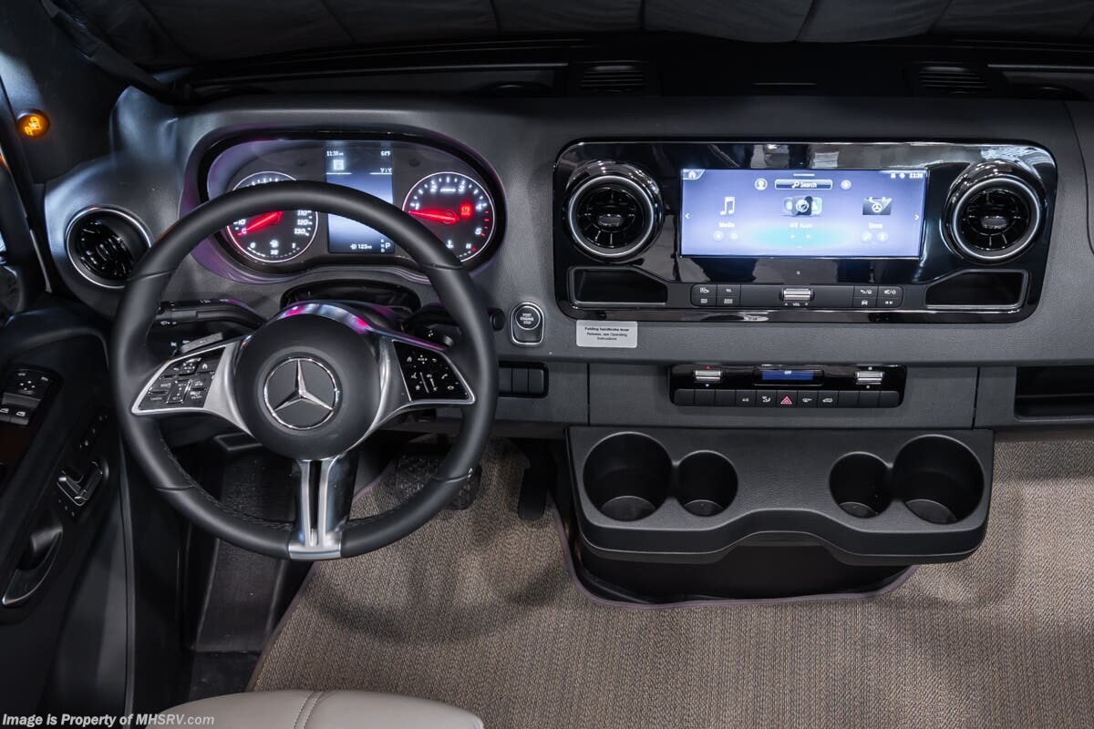More About This RV This RV features lippert leveling, full body paint, LP generator, Mercedes-Benz chassis, Mercedes-Benz diesel engine, tilt/telescoping steering wheel, smart wheel, GPS, power windows, water manifold, patio awning, baggade door side swing, LED running lights, black tank flush, exterior shower, clear paint mask, solar, inverter, leather seating, multi-plex control panel, hardwood cabinets, convection microwave, solid surface counters, overhead loft, theater seats and much more