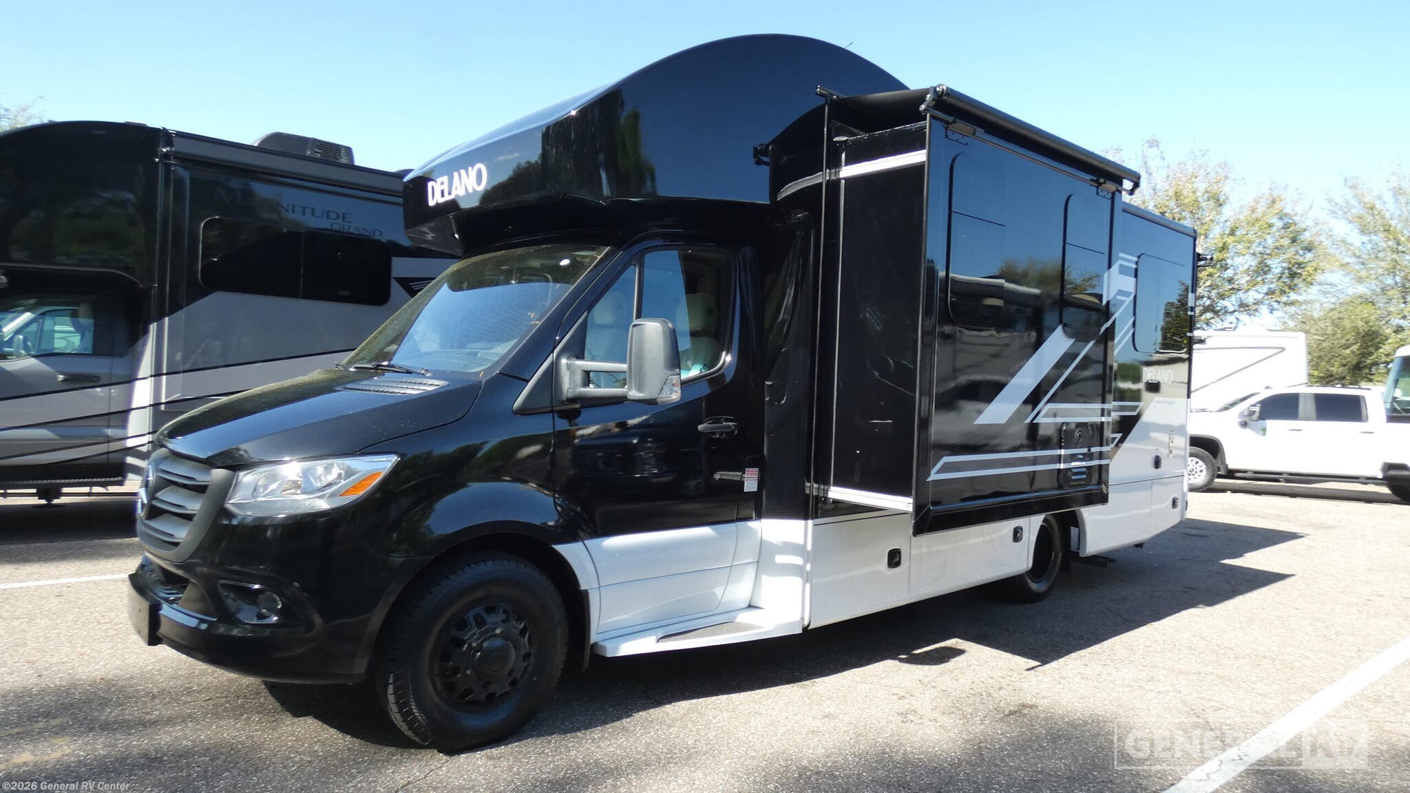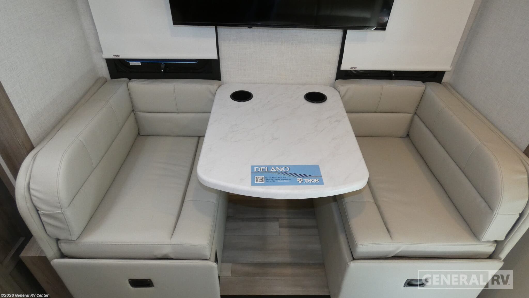 Thor Motor Coach Delano Sprinter Class C diesel motorhome 24RW highlights: Two TV's Convection Microwave with Air Fryer Booth Dinette Large Bedroom Wardrobe Cab-Over Bunk Cab Coffee Table You'll enjoy every minute spent in this double slide out coach that can sleep up to five each night. The main living area is made spacious thanks to the dinette slide out, and there is theater seating across from the 39" mid-ship Smart TV to watch your favorite shows. A cab-over bunk features a built-in skylight for star gazing at night, and the rear private bedroom will feel just like home. Here, you'll enjoy the flip-up full-size bed within the slide out, plus a 32" Smart TV and a wardrobe to keep your things tidy. There is a private toilet and sink across the hall from the 24" x 32" shower so two people can freshen up at once; how convenient! In the morning, prepare breakfast on the two burner gas cooktop, and the flip-up countertop will provide more space to cut fresh fruit! Luxury comes standard in the Delano Sprinter Class C diesel motorhomes by Thor Motor Coach. You will find it so easy to maneuver the road with the Mercedes-Benz Safety package that includes features such as active braking assist and distance regulator distronic plus that will help keep a safe distance from vehicles in front of you. The frameless windows and the full-body paint package with gel coated sidewalls is sure to be eye-catching, plus there is invisible front paint protection for added defense against the elements. Each model includes the Rapid Camp+ multiplex wiring control system that will make set-up easier than ever, a Winegard ConnecT 2.0 WiFi/4G/TV antenna to keep you connected to the outside world, and premium one-piece Crossflex roofing material that is ultra durable. The Delano Sprinter also includes many interior comforts, like the easy-to-clean residential vinyl flooring, the Euro-style cabinetry, and the Leatherette furniture!
