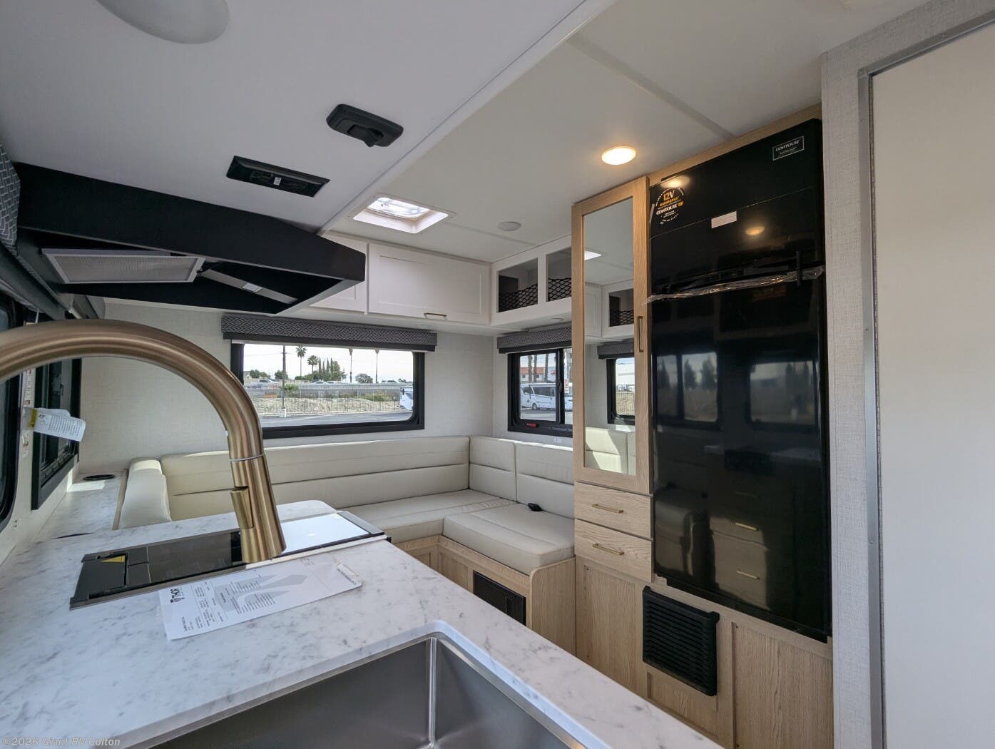 - Convertible Living & Dining Area featuring a booth dinette and cab-over bunk to accommodate guests or extra sleeping needs.