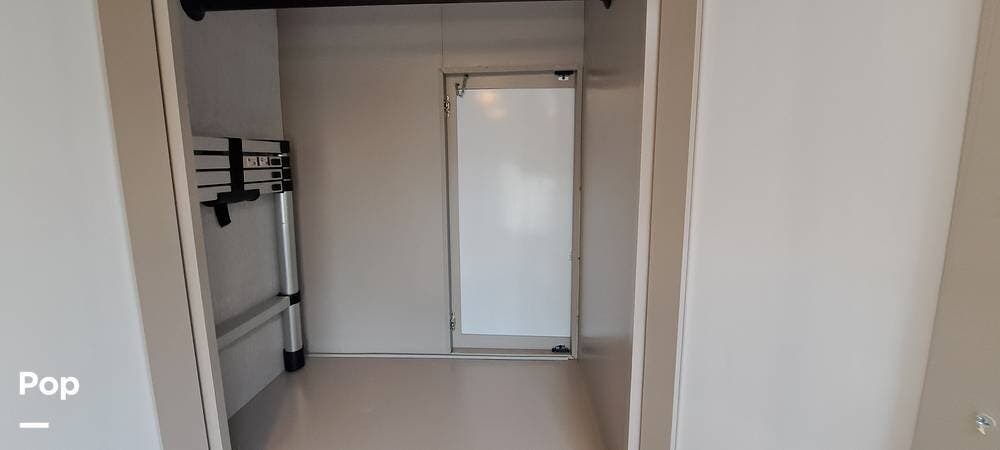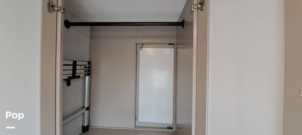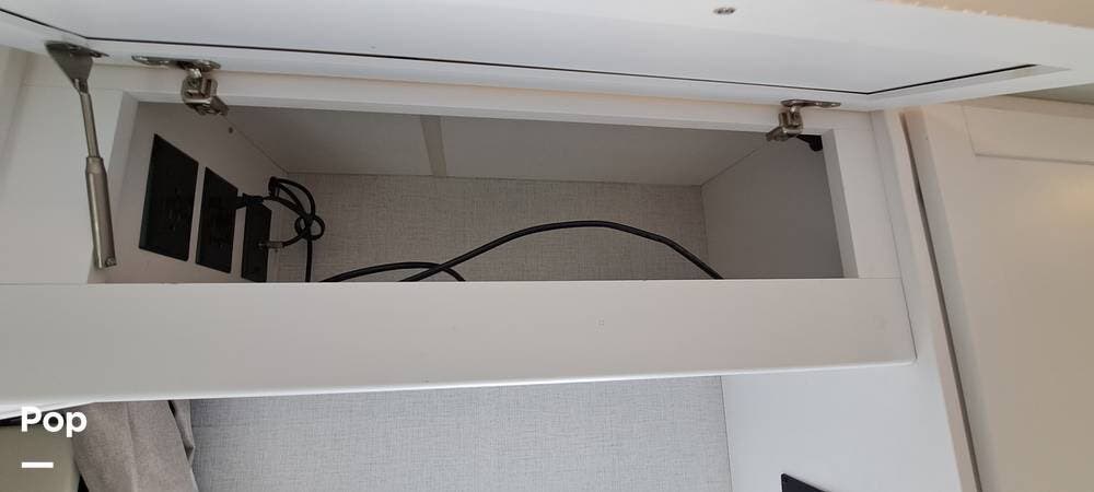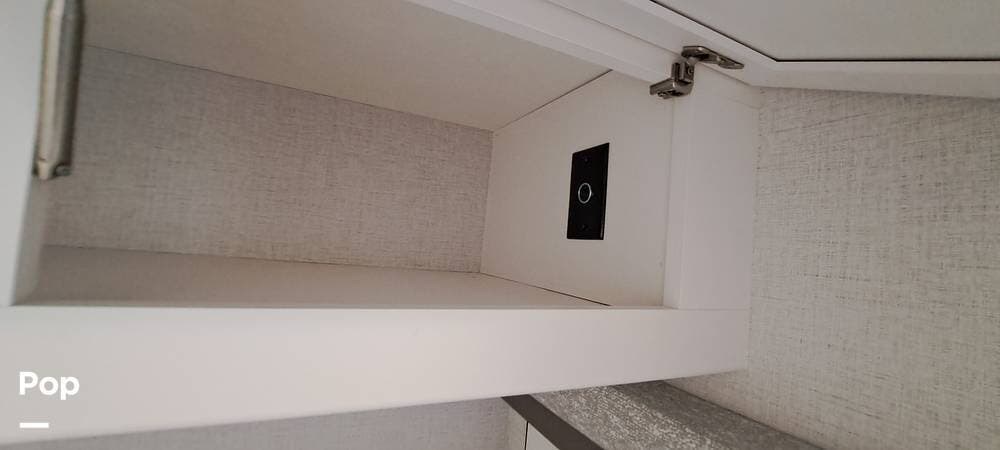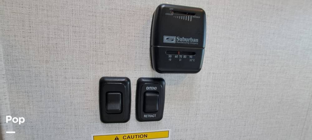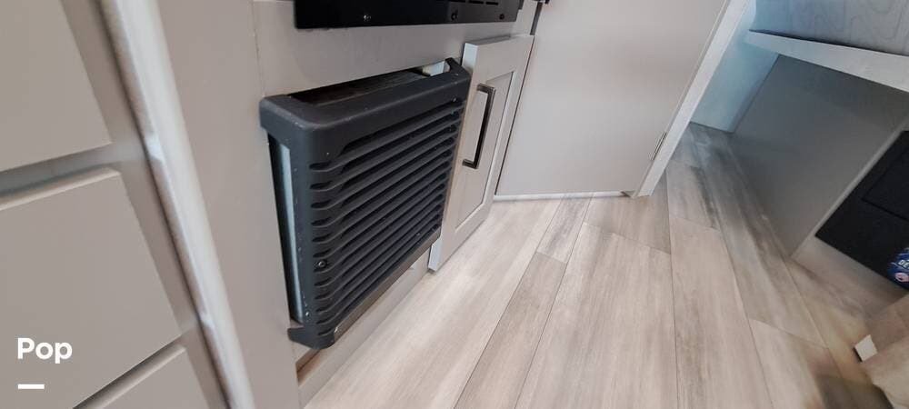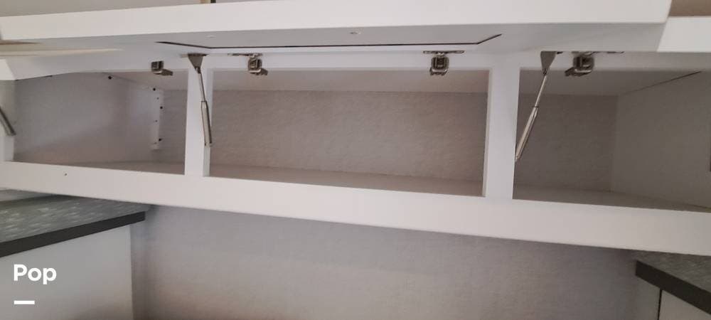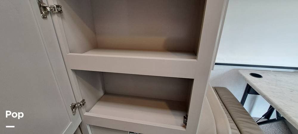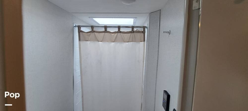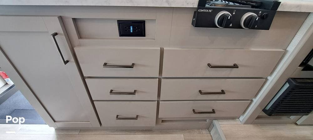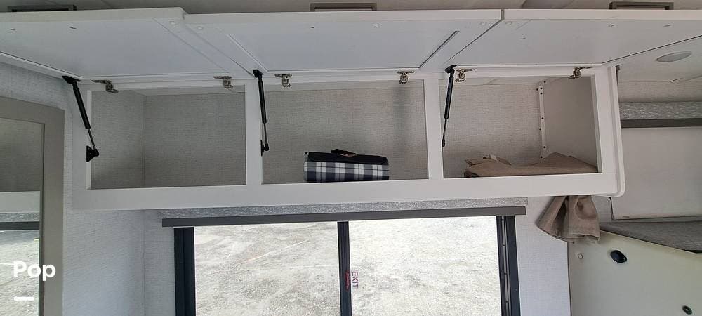 The versatile floor plan offers multiple sleeping areas, including a comfortable queen-size bed in the private bedroom area and a spacious cabover sleeping area complete with a 32" TV on a manual swivel. Families will appreciate the dual child safety tethers, while the window privacy roller shades provide comfort and seclusion. You'll find plenty of thoughtfully designed storage spaces throughout the RV to keep your belongings organized.