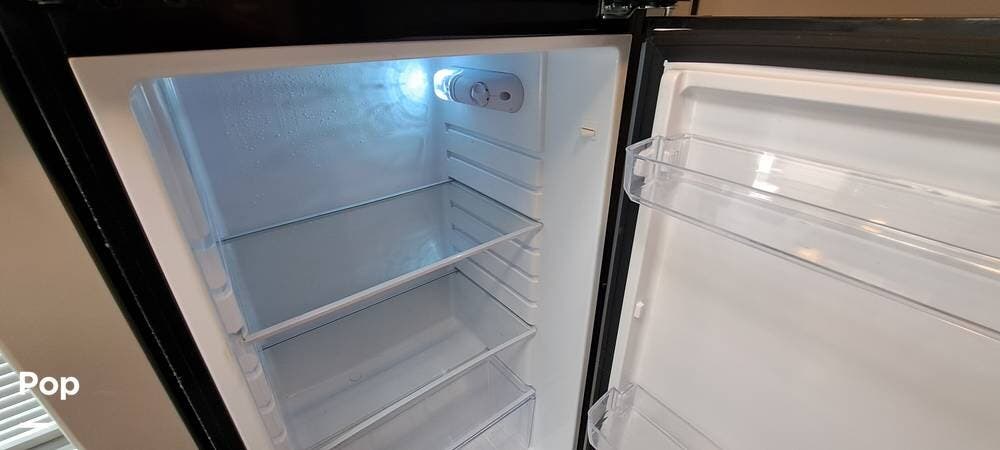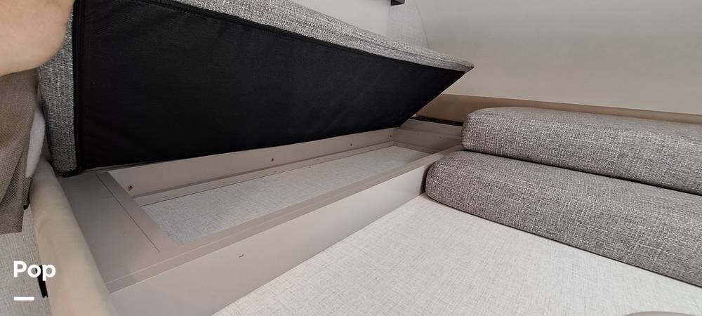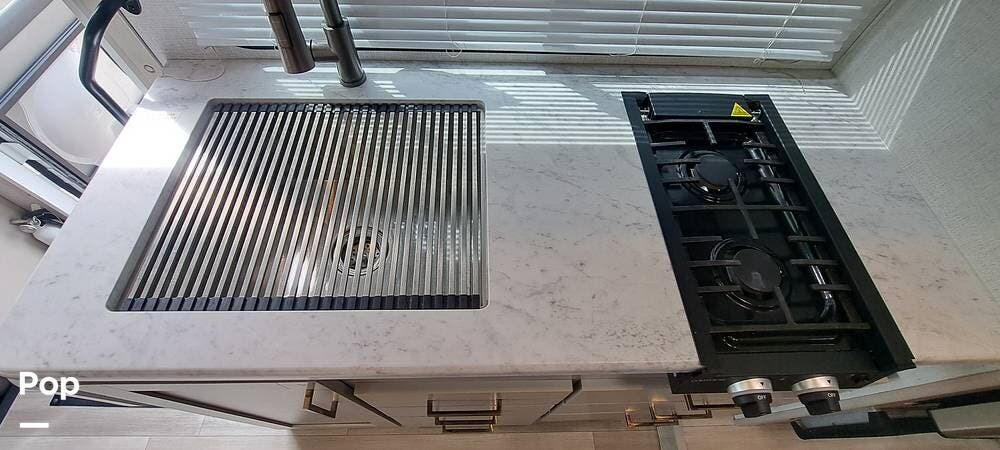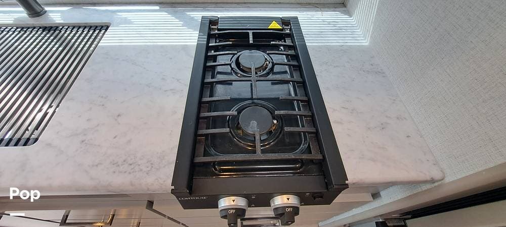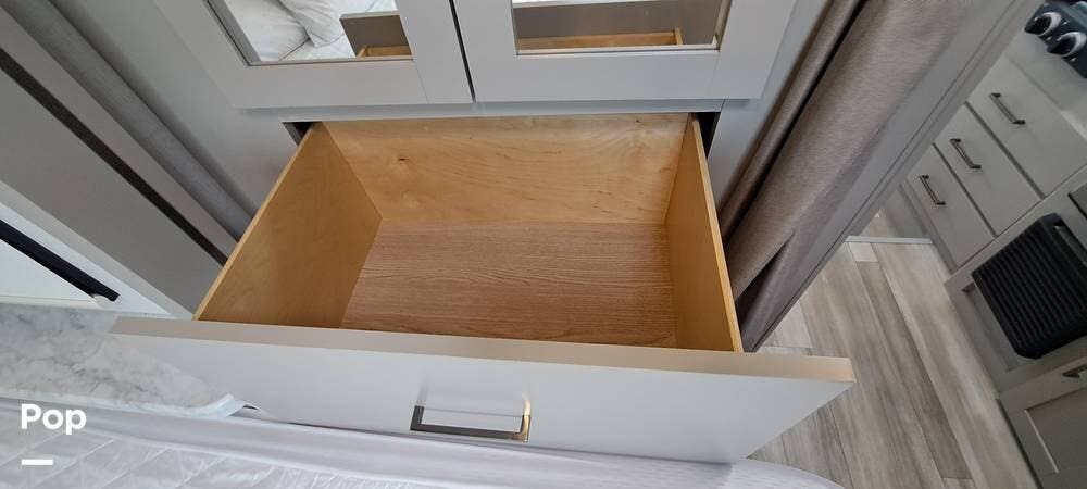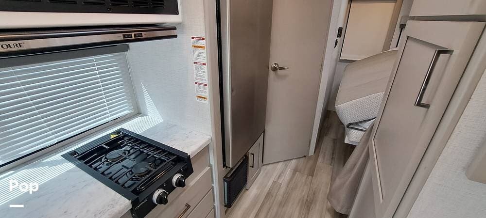 Prepare delicious meals in the well-equipped kitchen, which features a 12V refrigerator, a 2-burner gas cooktop with an elegant glass cover that maximizes counter space when not in use. The convection microwave oven with air fryer capabilities adds versatility to your cooking options, while the convenient flip-up countertop extension provides extra prep space when needed. This RV also boasts a massive exterior storage compartment for all your camping essentials, providing ample space for gear and supplies.