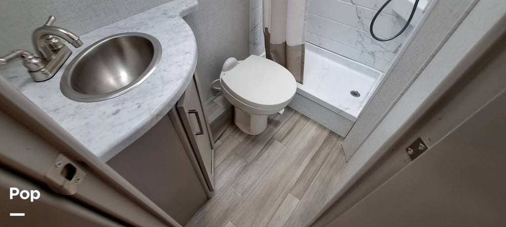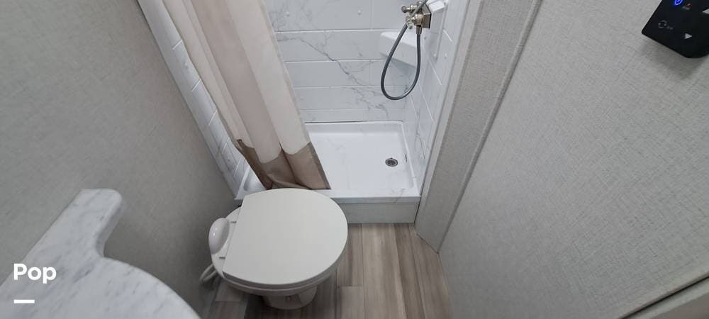 The full bathroom offers all the amenities of home, while the black tank flush system simplifies maintenance. Convenient USB charging stations and a 12V outlet in the bedroom area keep your devices powered.