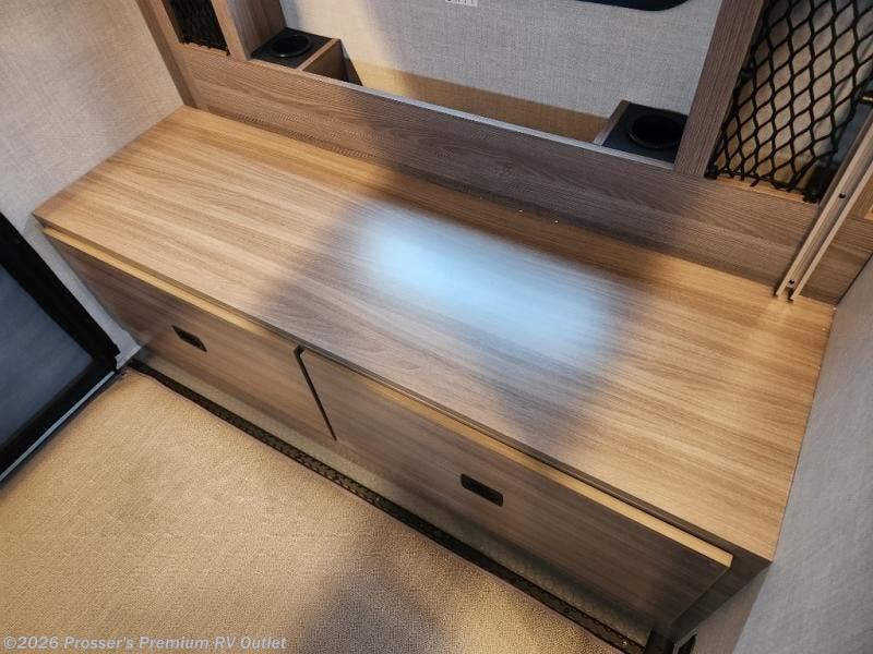 Step inside our incredible motorhome and discover a world of comfort, style, and adventure. The spacious queen-sized bunk features storage and drawers below, perfect for keeping your belongings organized and within reach. A convenient closet provides ample storage for your clothing and accessories, while the 12V double door refrigerator keeps your favorite foods and drinks fresh and chilled. The single burner countertop, microwave, and dinette with adjustable/removable table provide everything you need to prepare and enjoy delicious meals on the go. Additional features include a flip-up countertop for added convenience, and a full bathroom with a spacious 30” x 36” shower. Relax and unwind after a long day of adventure with our 32” Smart TV, perfect for streaming your favorite shows and movies.