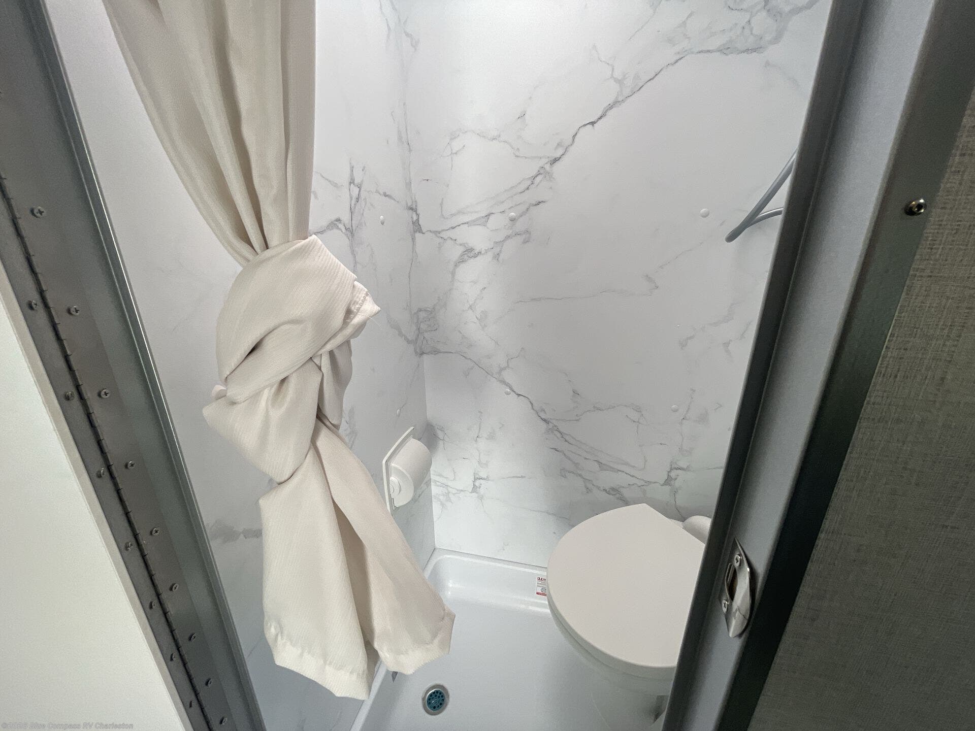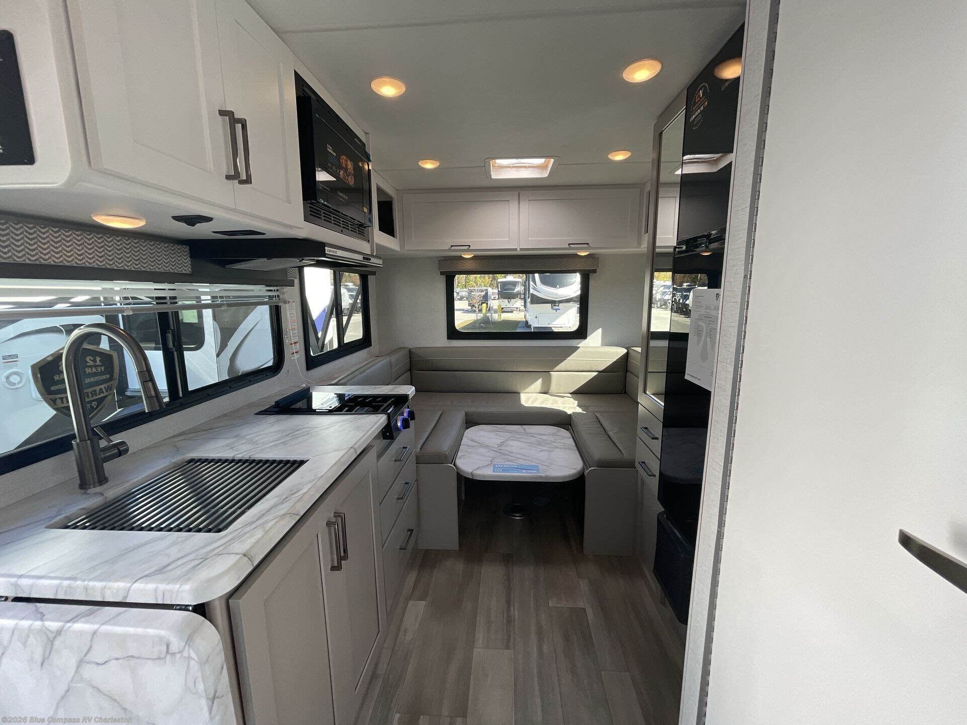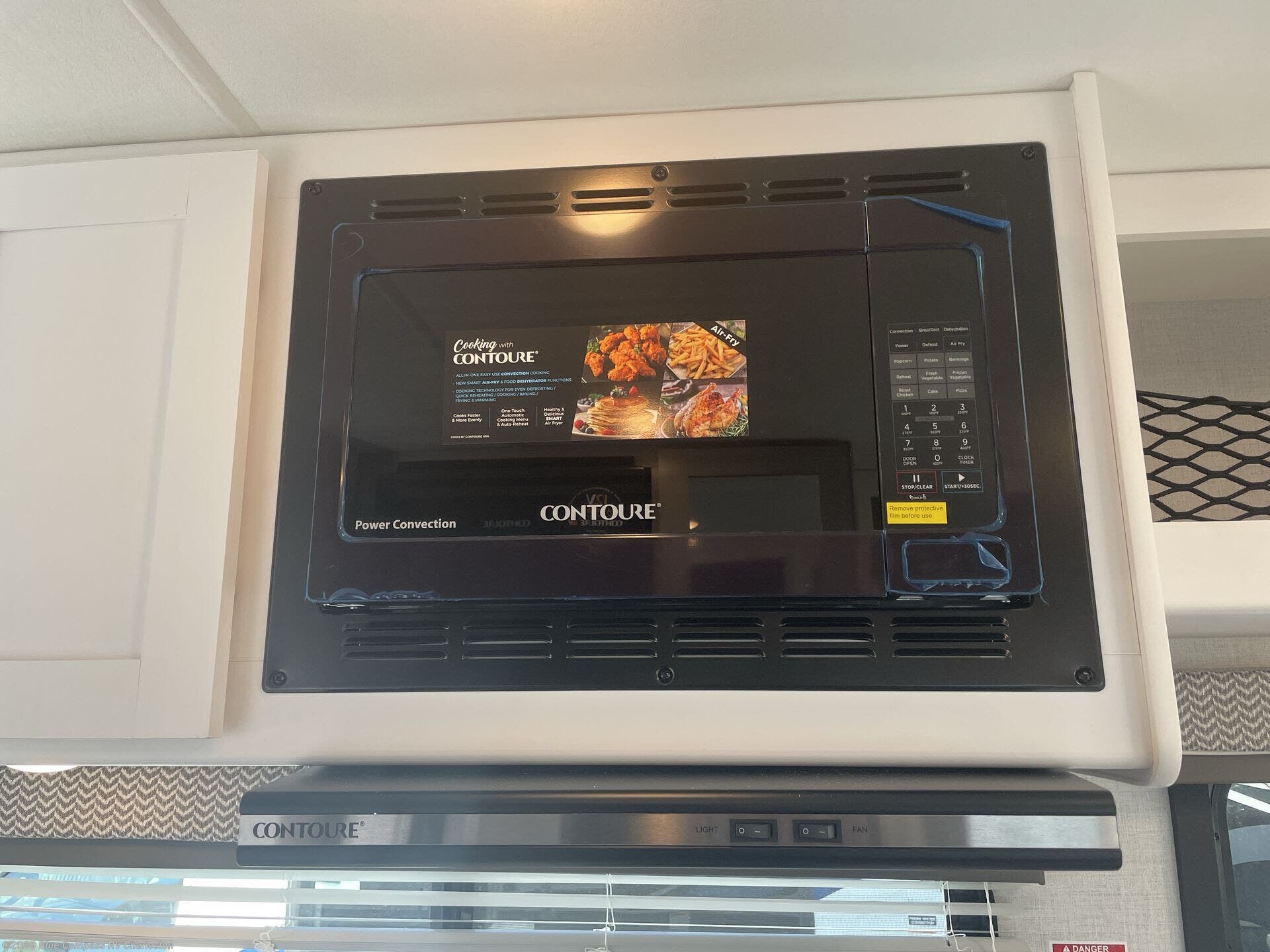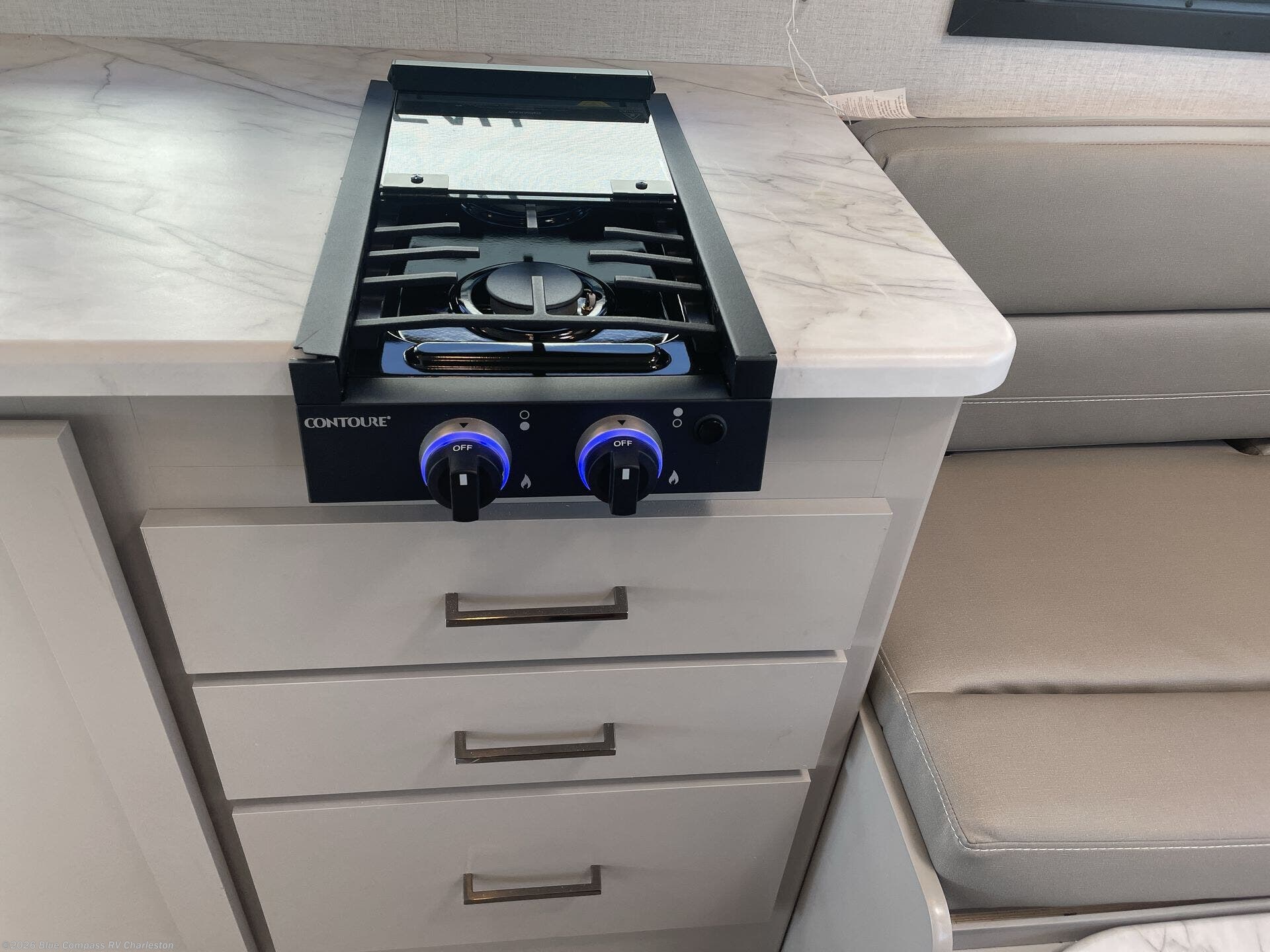 This cozy coach is perfect for three to four happy campers! Once you stop for the day, you can freshen up in the wet bath that includes a foot flush toilet, power vent, and shower skylight for more natural lighting. The two burner cooktop and convection microwave with an air fryer will let you make meals each day, and the 12V refrigerator will keep your food fresh. You'll also appreciate the flip-up countertop for more space to prep meals. There is a U-shaped dinette with a removable table that will convert to a 54" x 77" bed, while the little ones take the cab-over bunk with a 52" x 91" sleeping area.