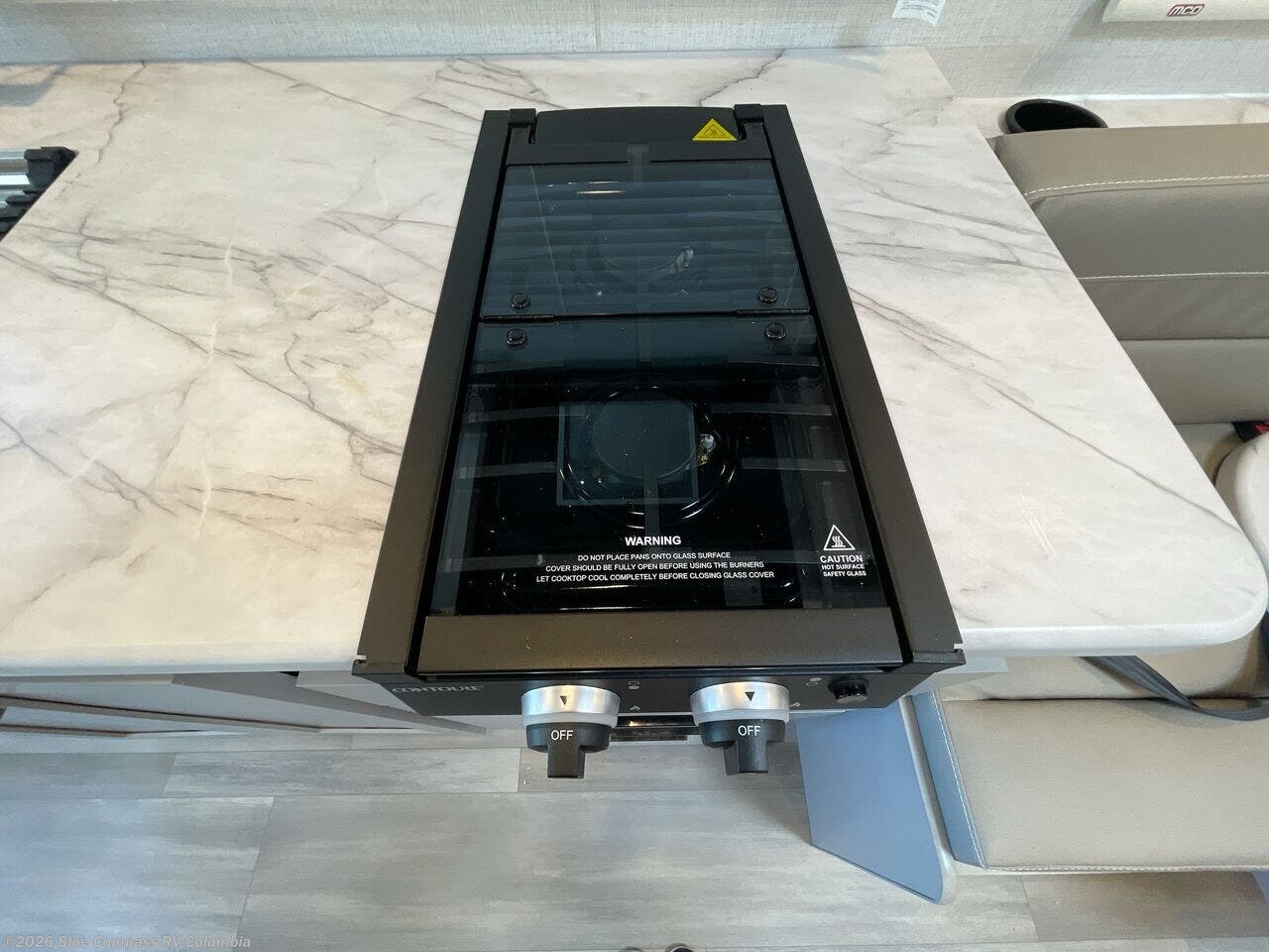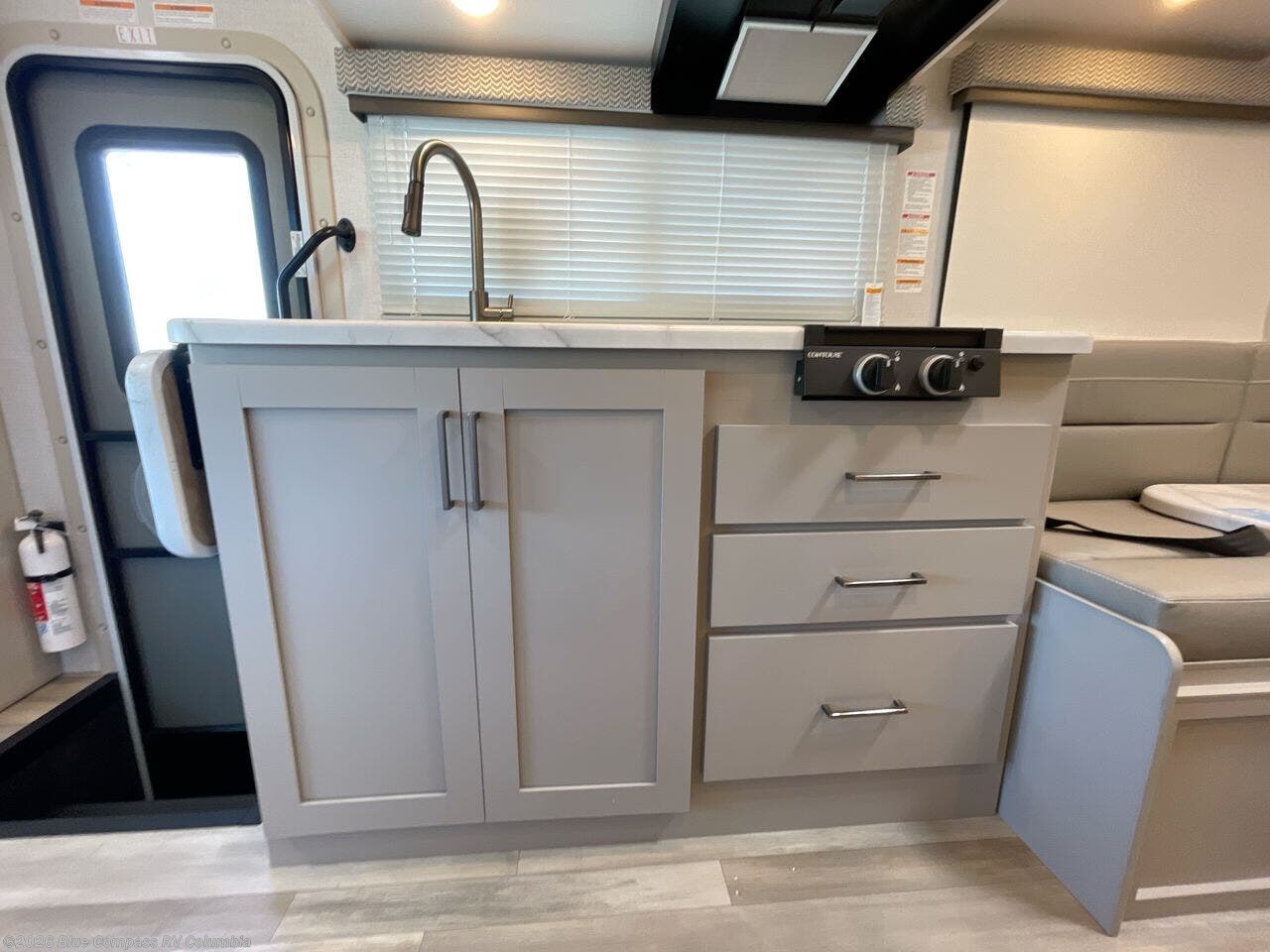 This cozy coach is perfect for three to four happy campers! Once you stop for the day, you can freshen up in the wet bath that includes a foot flush toilet, power vent, and shower skylight for more natural lighting. The two burner cooktop and convection microwave with an air fryer will let you make meals each day, and the 12V refrigerator will keep your food fresh. You'll also appreciate the flip-up countertop for more space to prep meals. There is a U-shaped dinette with a removable table that will convert to a 54" x 77" bed, while the little ones take the cab-over bunk with a 52" x 91" sleeping area.