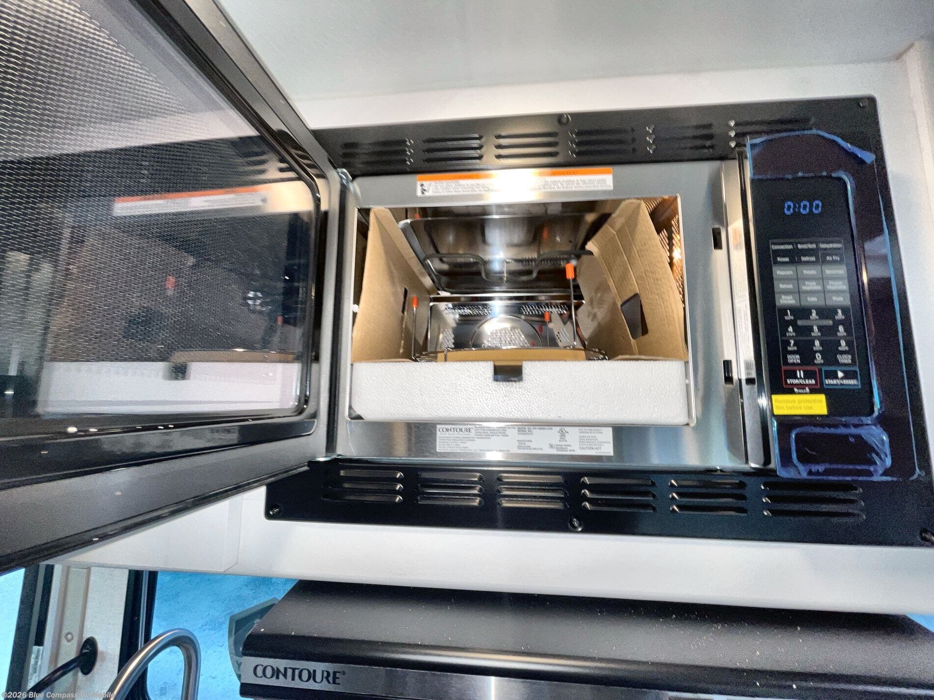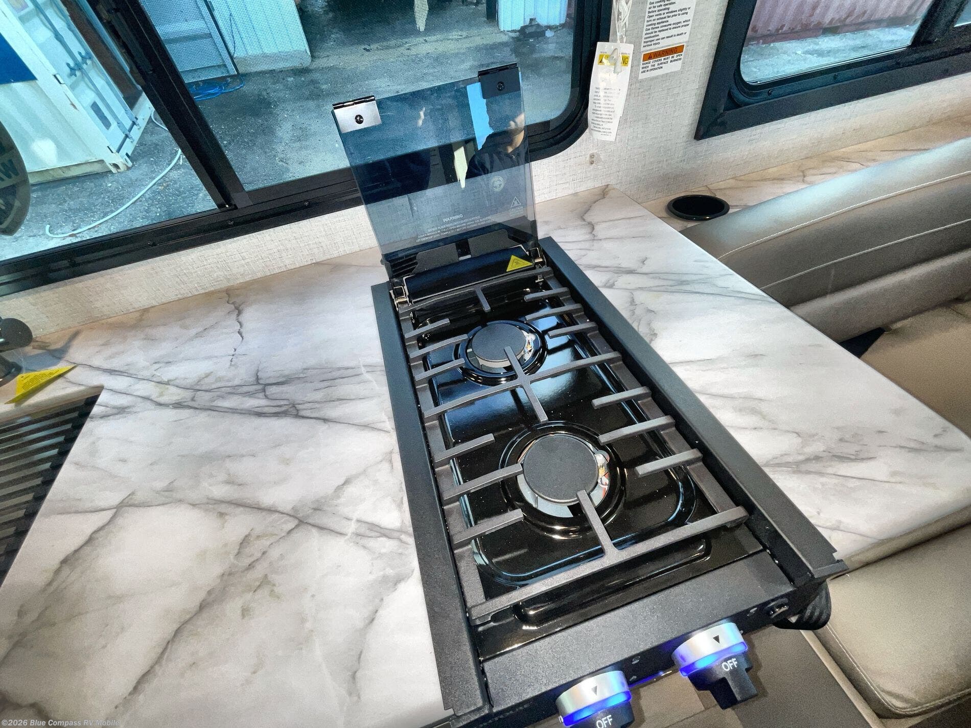 This cozy coach is perfect for three to four happy campers! Once you stop for the day, you can freshen up in the wet bath that includes a foot flush toilet, power vent, and shower skylight for more natural lighting. The two burner cooktop and convection microwave with an air fryer will let you make meals each day, and the 12V refrigerator will keep your food fresh. You'll also appreciate the flip-up countertop for more space to prep meals. There is a U-shaped dinette with a removable table that will convert to a 54" x 77" bed, while the little ones take the cab-over bunk with a 52" x 91" sleeping area.