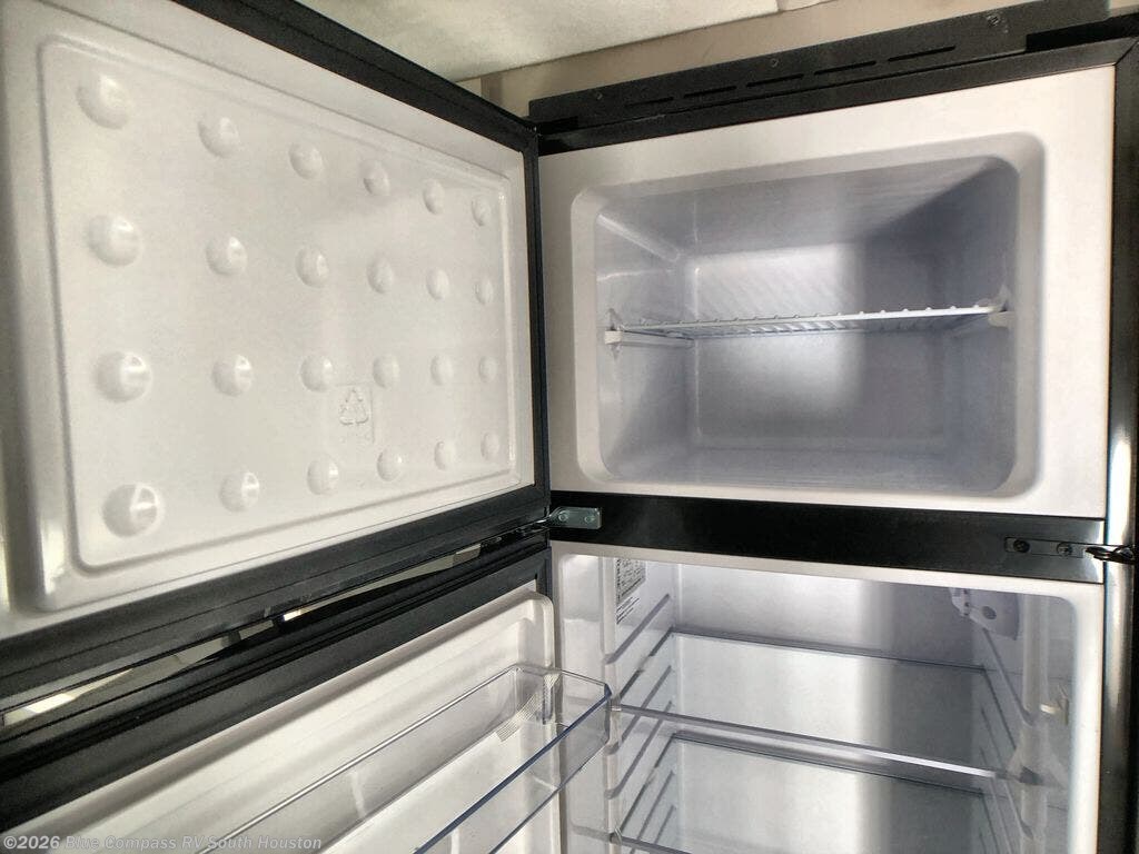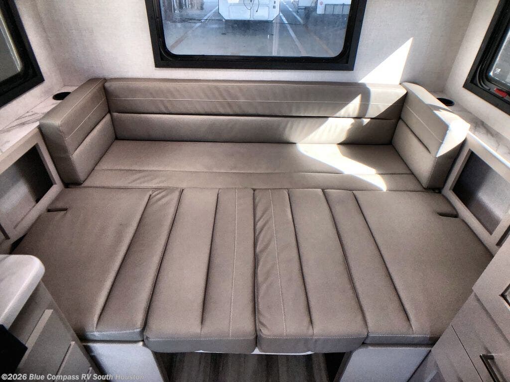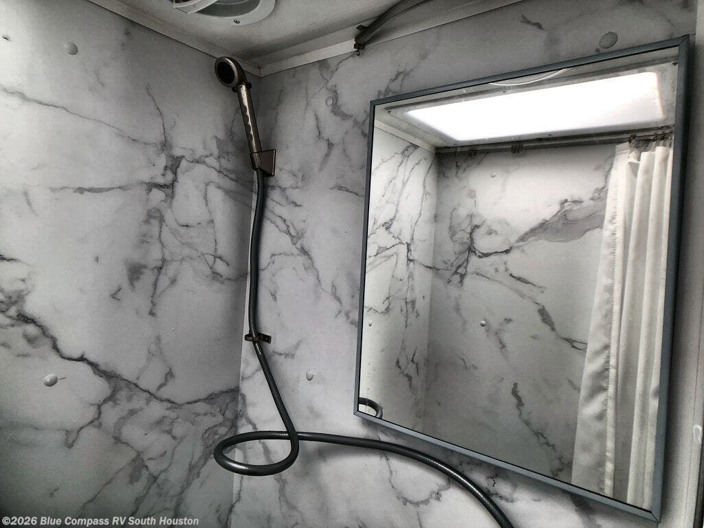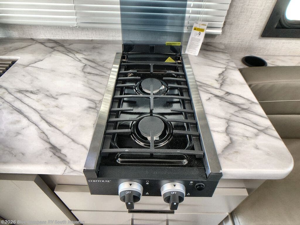 This cozy coach is perfect for three to four happy campers! Once you stop for the day, you can freshen up in the wet bath that includes a foot flush toilet, power vent, and shower skylight for more natural lighting. The two burner cooktop and convection microwave with an air fryer will let you make meals each day, and the 12V refrigerator will keep your food fresh. You'll also appreciate the flip-up countertop for more space to prep meals. There is a U-shaped dinette with a removable table that will convert to a 54" x 77" bed, while the little ones take the cab-over bunk with a 52" x 91" sleeping area.