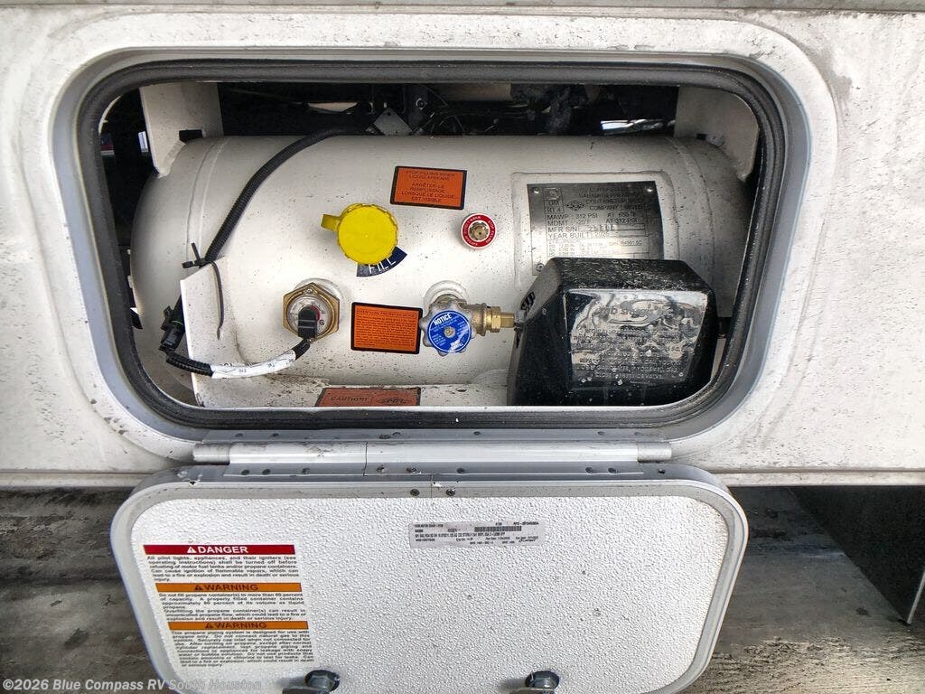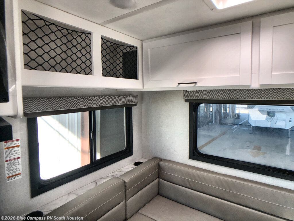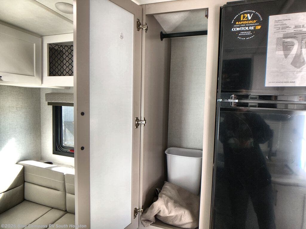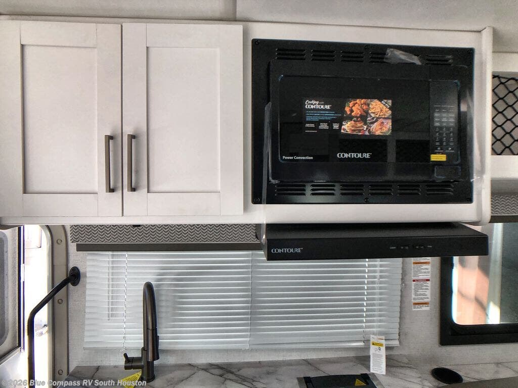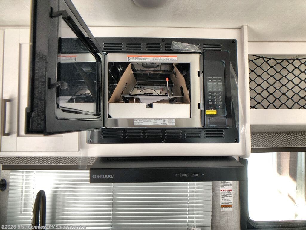 This cozy coach is perfect for three to four happy campers! Once you stop for the day, you can freshen up in the wet bath that includes a foot flush toilet, power vent, and shower skylight for more natural lighting. The two burner cooktop and convection microwave with an air fryer will let you make meals each day, and the 12V refrigerator will keep your food fresh. You'll also appreciate the flip-up countertop for more space to prep meals. There is a U-shaped dinette with a removable table that will convert to a 54" x 77" bed, while the little ones take the cab-over bunk with a 52" x 91" sleeping area.