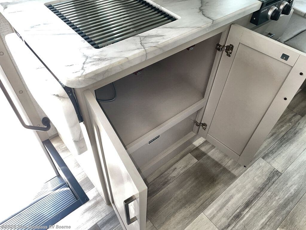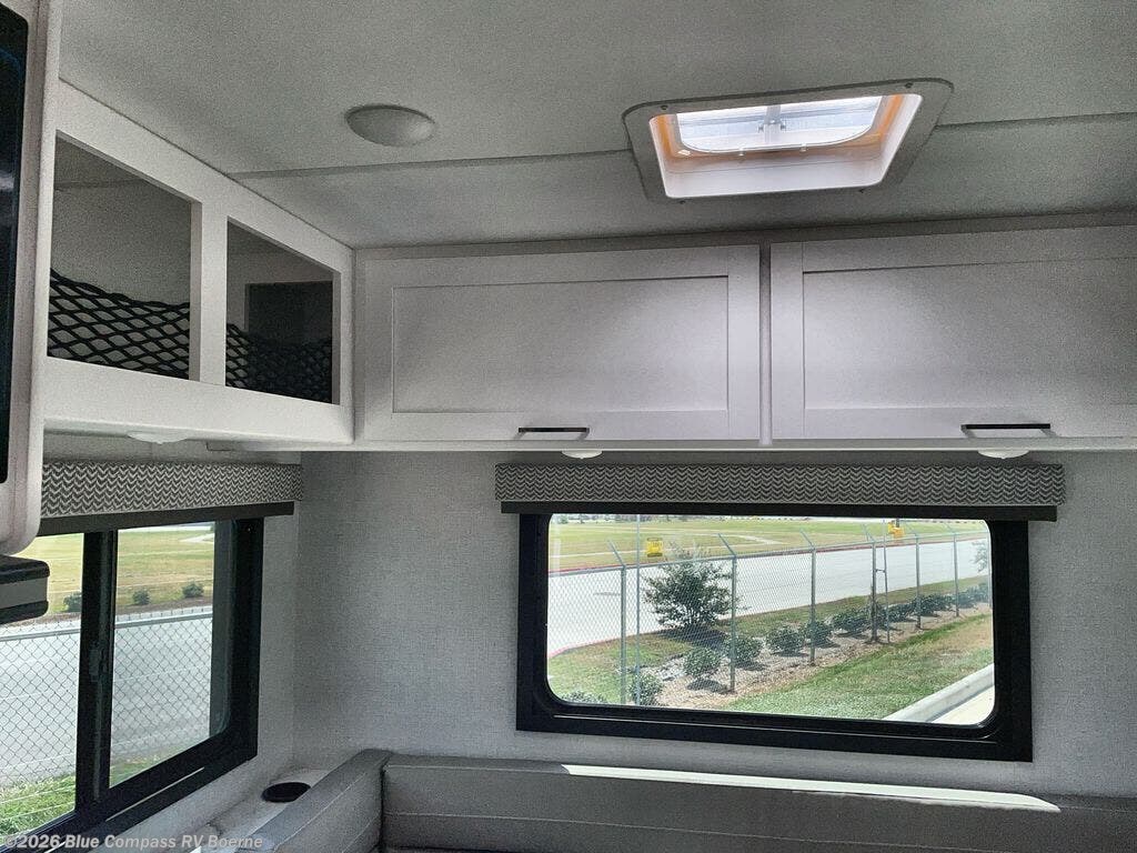 This cozy coach is perfect for three to four happy campers! Once you stop for the day, you can freshen up in the wet bath that includes a foot flush toilet, power vent, and shower skylight for more natural lighting. The two burner cooktop and convection microwave with an air fryer will let you make meals each day, and the 12V refrigerator will keep your food fresh. You'll also appreciate the flip-up countertop for more space to prep meals. There is a U-shaped dinette with a removable table that will convert to a 54" x 77" bed, while the little ones take the cab-over bunk with a 52" x 91" sleeping area.