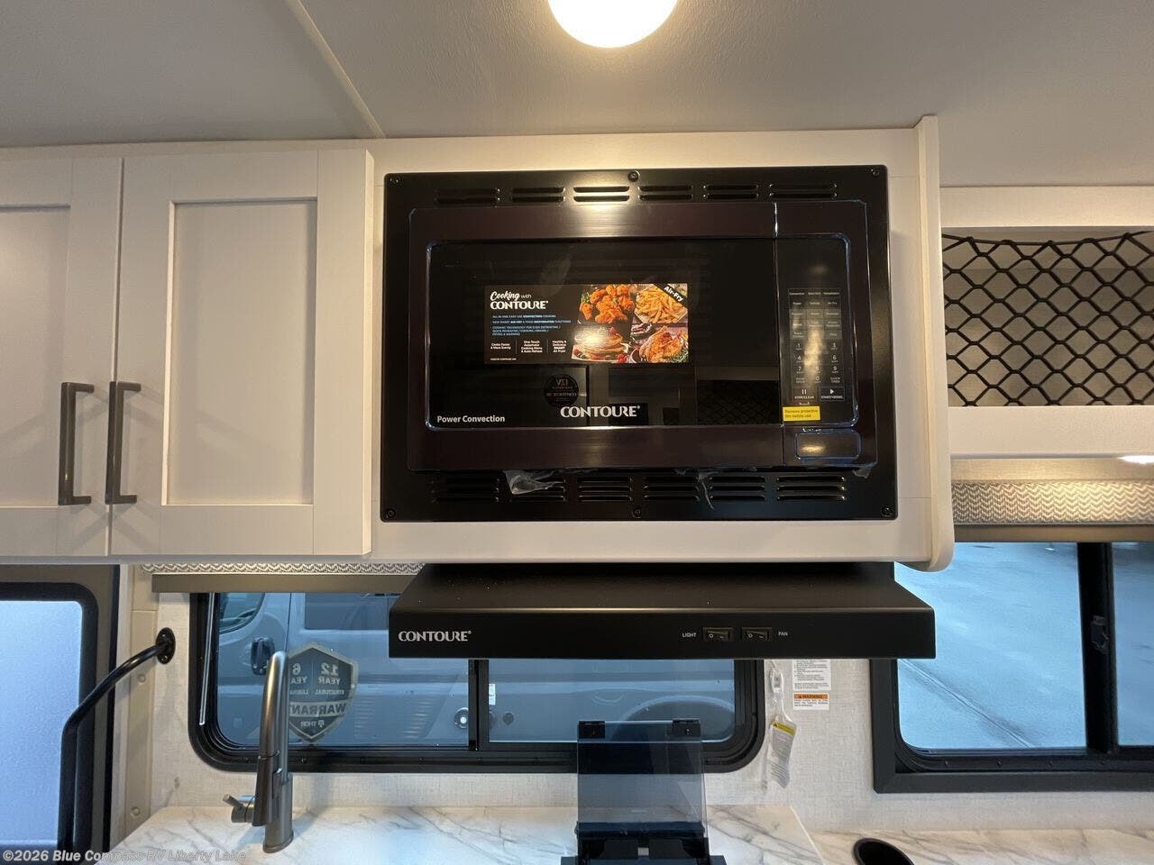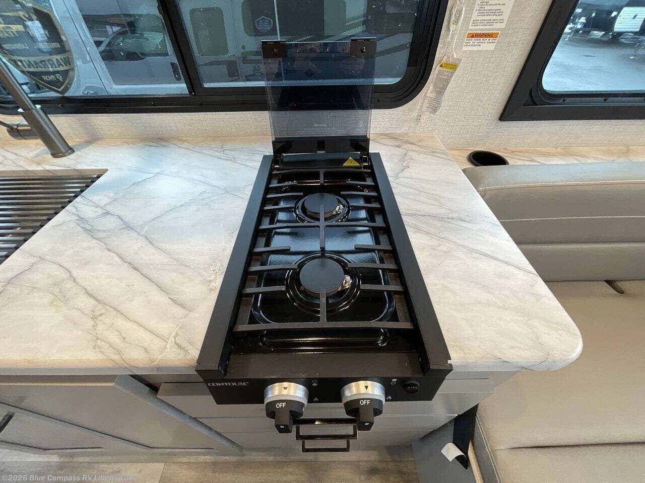 This cozy coach is perfect for three to four happy campers! Once you stop for the day, you can freshen up in the wet bath that includes a foot flush toilet, power vent, and shower skylight for more natural lighting. The two burner cooktop and convection microwave with an air fryer will let you make meals each day, and the 12V refrigerator will keep your food fresh. You'll also appreciate the flip-up countertop for more space to prep meals. There is a U-shaped dinette with a removable table that will convert to a 54" x 77" bed, while the little ones take the cab-over bunk with a 52" x 91" sleeping area.
