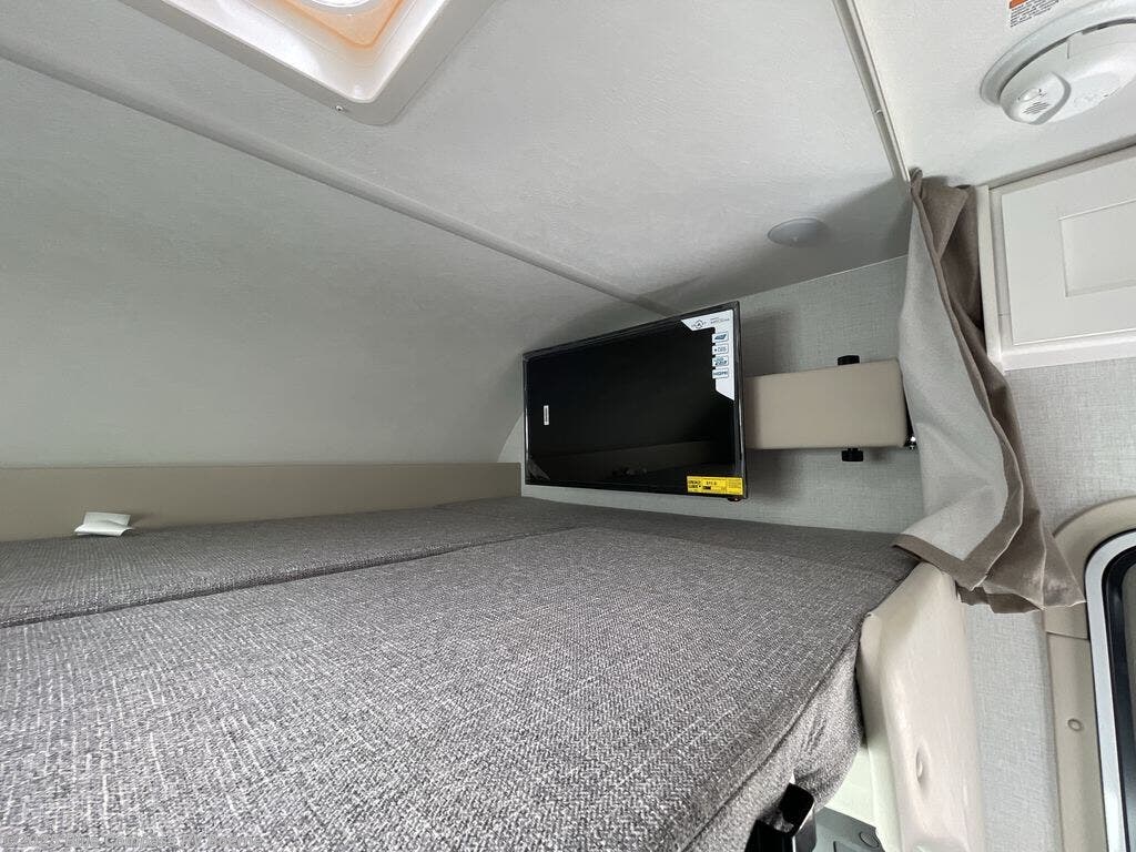 This cozy coach is perfect for three to four happy campers! Once you stop for the day, you can freshen up in the wet bath that includes a foot flush toilet, power vent, and shower skylight for more natural lighting. The two burner cooktop and convection microwave with an air fryer will let you make meals each day, and the 12V refrigerator will keep your food fresh. You'll also appreciate the flip-up countertop for more space to prep meals. There is a U-shaped dinette with a removable table that will convert to a 54" x 77" bed, while the little ones take the cab-over bunk with a 52" x 91" sleeping area.