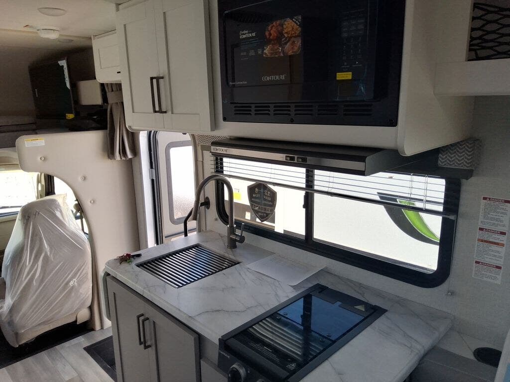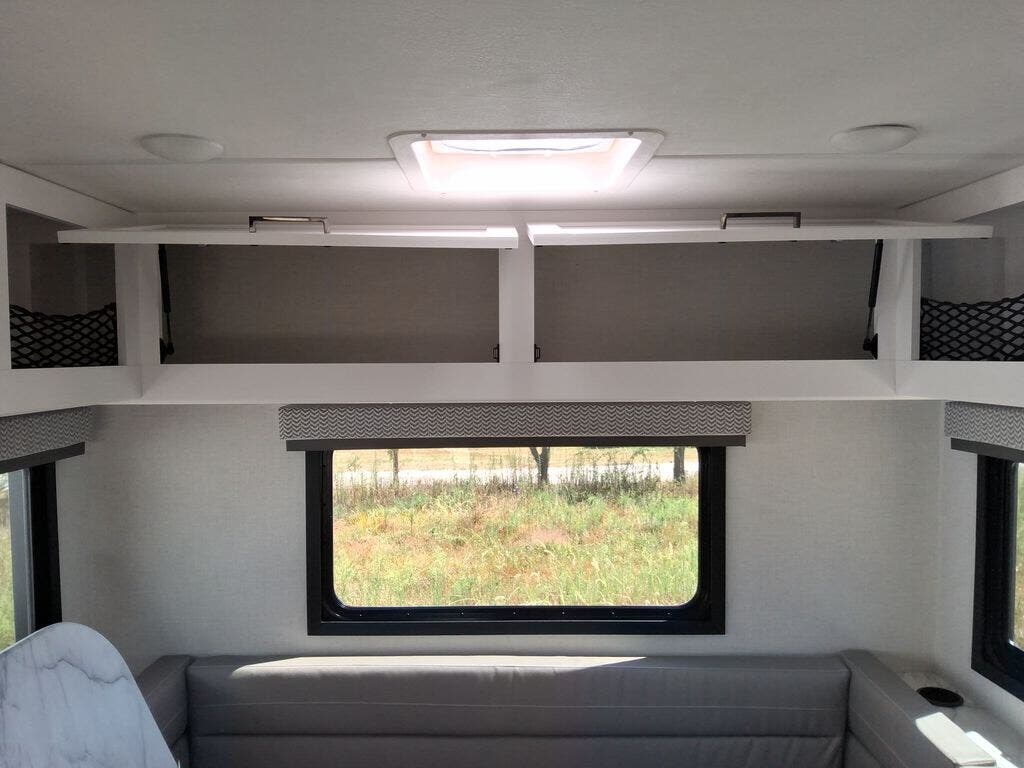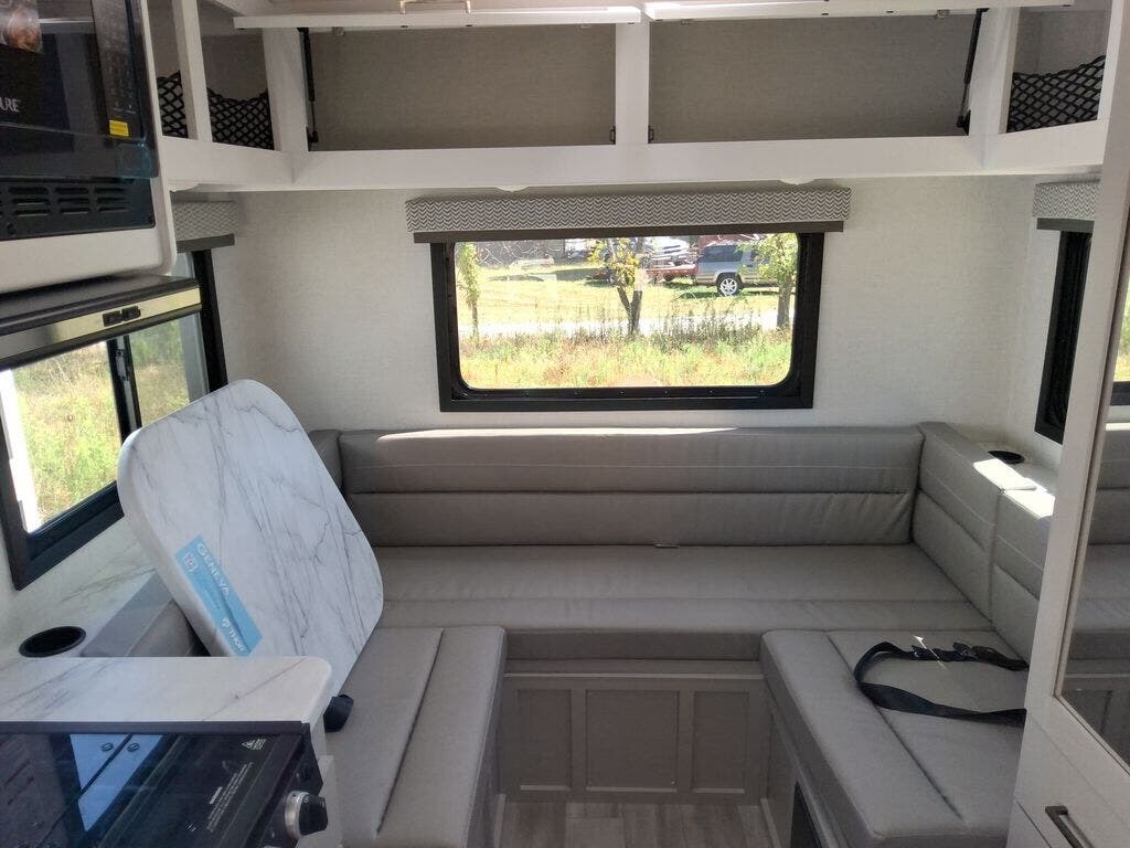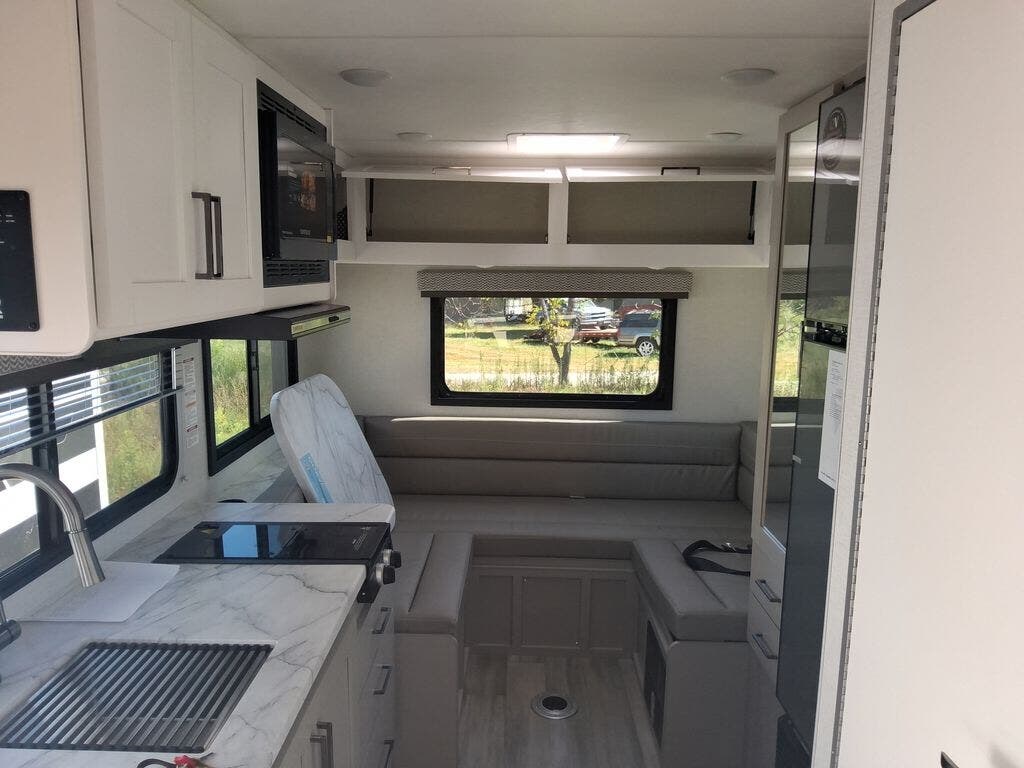 This cozy coach is perfect for three to four happy campers! Once you stop for the day, you can freshen up in the wet bath that includes a foot flush toilet, power vent, and shower skylight for more natural lighting. The two burner cooktop and convection microwave with an air fryer will let you make meals each day, and the 12V refrigerator will keep your food fresh. You'll also appreciate the flip-up countertop for more space to prep meals. There is a U-shaped dinette with a removable table that will convert to a 54" x 77" bed, while the little ones take the cab-over bunk with a 52" x 91" sleeping area.