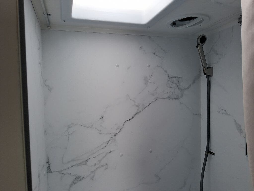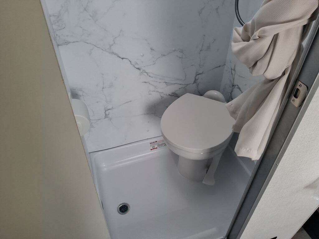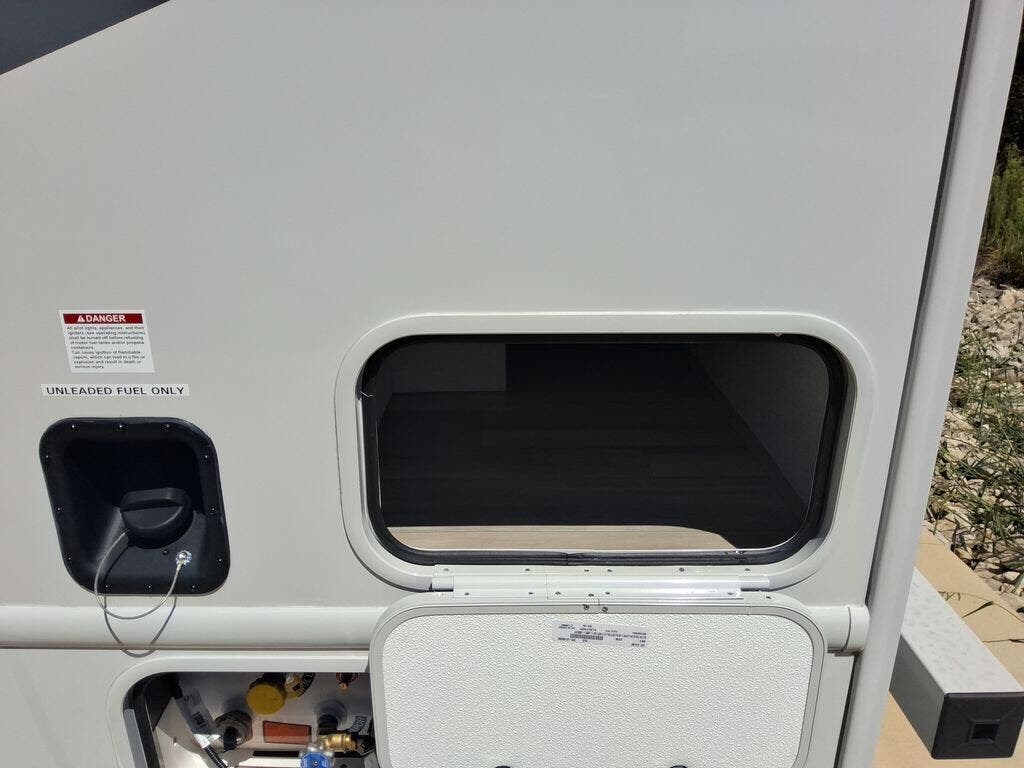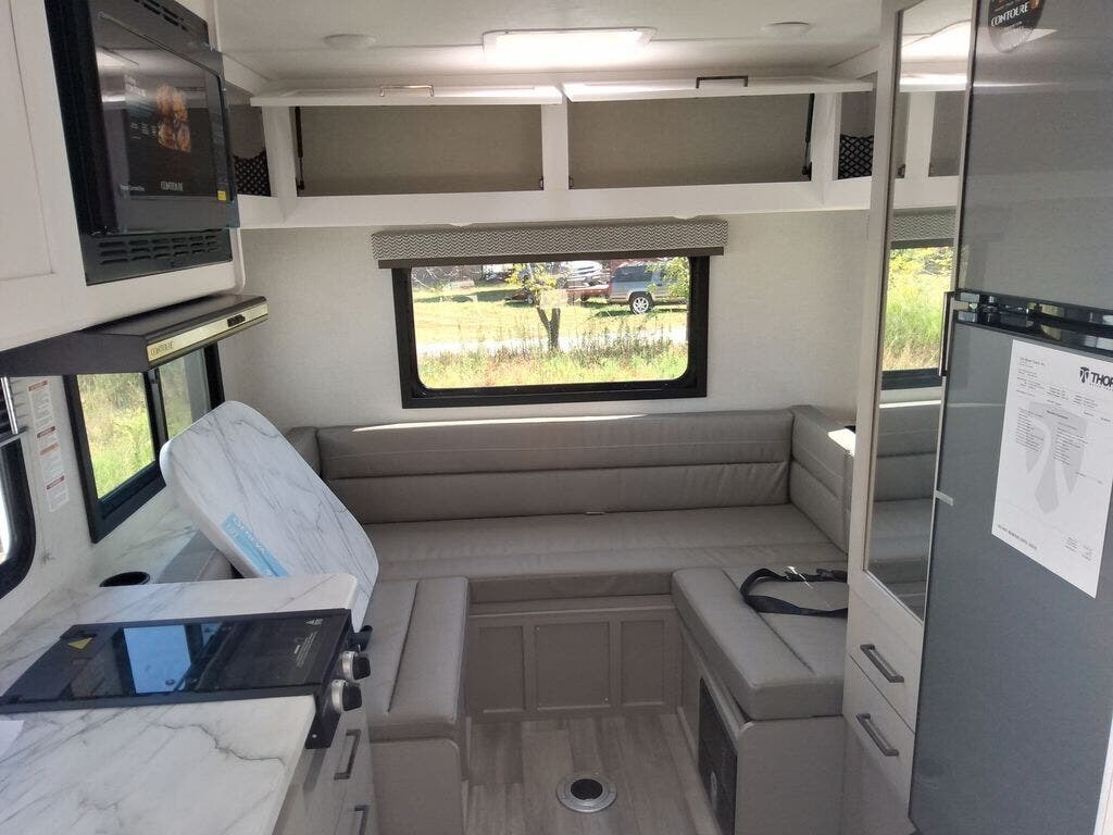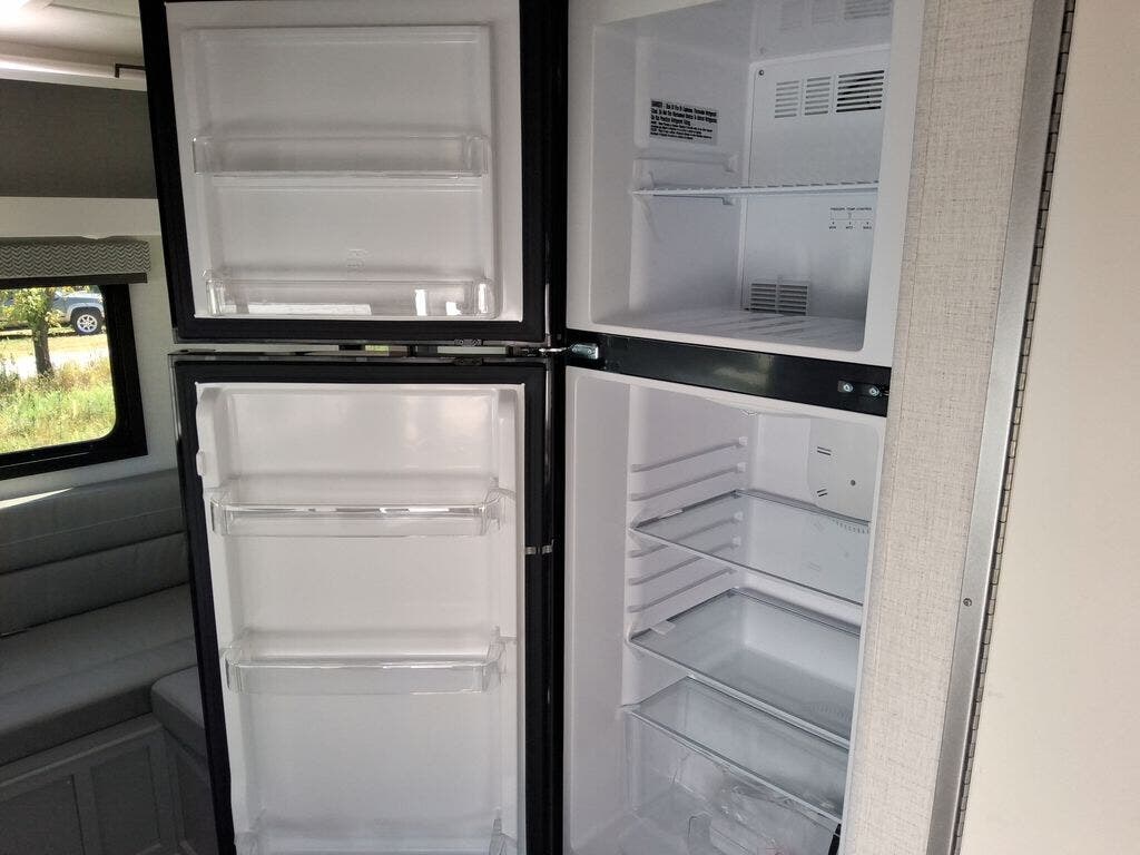 This cozy coach is perfect for three to four happy campers! Once you stop for the day, you can freshen up in the wet bath that includes a foot flush toilet, power vent, and shower skylight for more natural lighting. The two burner cooktop and convection microwave with an air fryer will let you make meals each day, and the 12V refrigerator will keep your food fresh. You'll also appreciate the flip-up countertop for more space to prep meals. There is a U-shaped dinette with a removable table that will convert to a 54" x 77" bed, while the little ones take the cab-over bunk with a 52" x 91" sleeping area.
