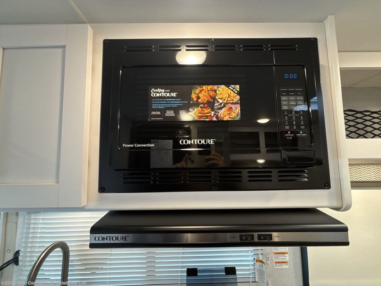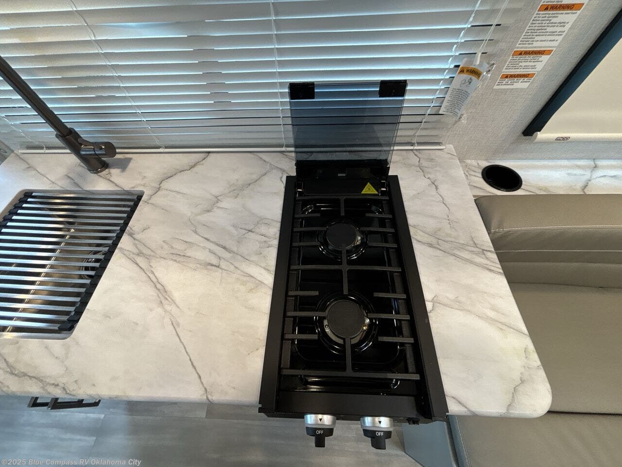 This cozy coach is perfect for three to four happy campers! Once you stop for the day, you can freshen up in the wet bath that includes a foot flush toilet, power vent, and shower skylight for more natural lighting. The two burner cooktop and convection microwave with an air fryer will let you make meals each day, and the 12V refrigerator will keep your food fresh. You'll also appreciate the flip-up countertop for more space to prep meals. There is a U-shaped dinette with a removable table that will convert to a 54" x 77" bed, while the little ones take the cab-over bunk with a 52" x 91" sleeping area.