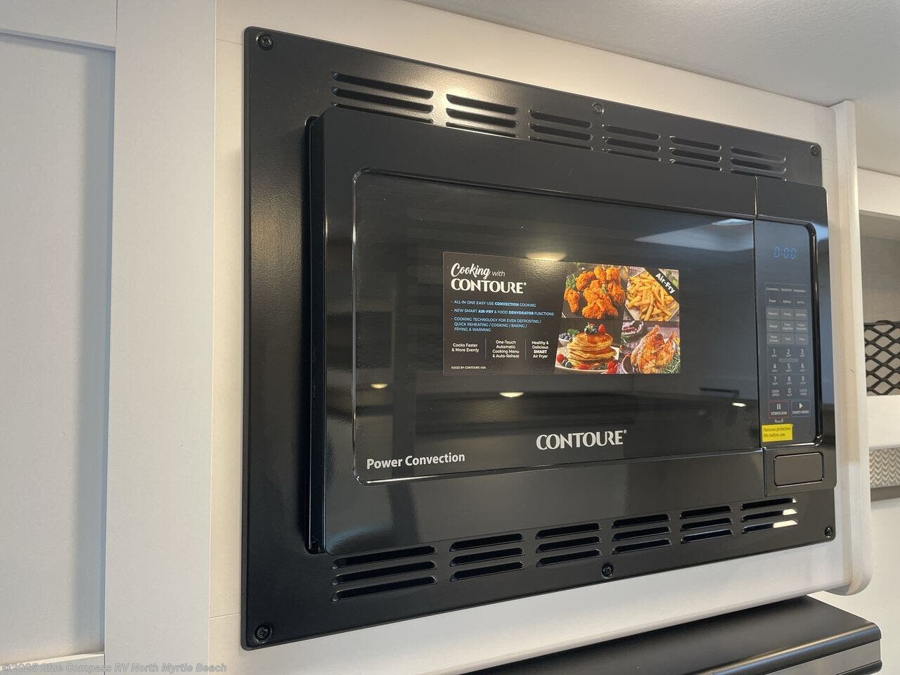 This cozy coach is perfect for three to four happy campers! Once you stop for the day, you can freshen up in the wet bath that includes a foot flush toilet, power vent, and shower skylight for more natural lighting. The two burner cooktop and convection microwave with an air fryer will let you make meals each day, and the 12V refrigerator will keep your food fresh. You'll also appreciate the flip-up countertop for more space to prep meals. There is a U-shaped dinette with a removable table that will convert to a 54" x 77" bed, while the little ones take the cab-over bunk with a 52" x 91" sleeping area.
