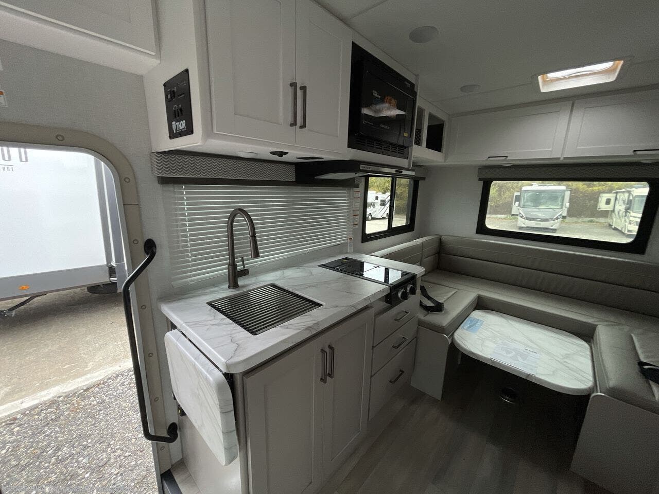 This cozy coach is perfect for three to four happy campers! Once you stop for the day, you can freshen up in the wet bath that includes a foot flush toilet, power vent, and shower skylight for more natural lighting. The two burner cooktop and convection microwave with an air fryer will let you make meals each day, and the 12V refrigerator will keep your food fresh. You'll also appreciate the flip-up countertop for more space to prep meals. There is a U-shaped dinette with a removable table that will convert to a 54" x 77" bed, while the little ones take the cab-over bunk with a 52" x 91" sleeping area.