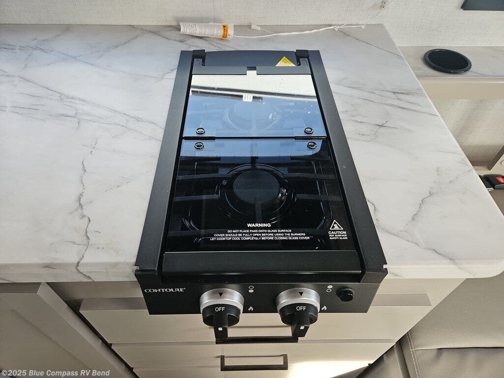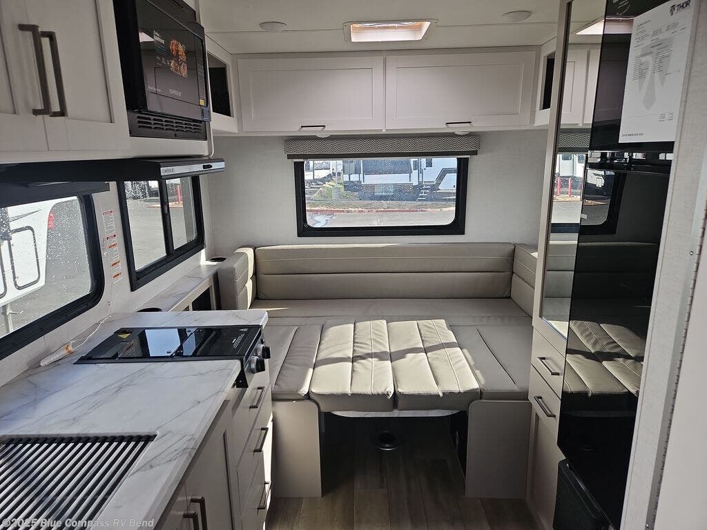 This cozy coach is perfect for three to four happy campers! Once you stop for the day, you can freshen up in the wet bath that includes a foot flush toilet, power vent, and shower skylight for more natural lighting. The two burner cooktop and convection microwave with an air fryer will let you make meals each day, and the 12V refrigerator will keep your food fresh. You'll also appreciate the flip-up countertop for more space to prep meals. There is a U-shaped dinette with a removable table that will convert to a 54" x 77" bed, while the little ones take the cab-over bunk with a 52" x 91" sleeping area.