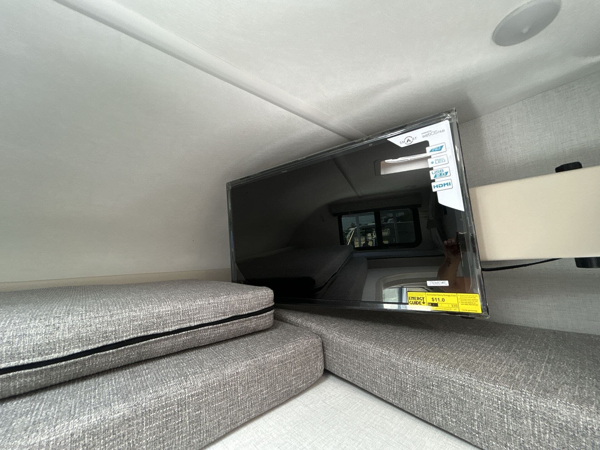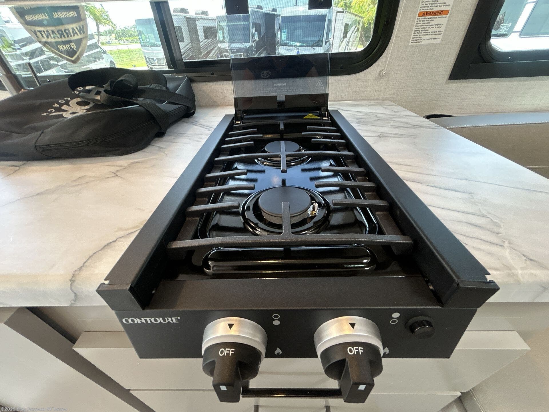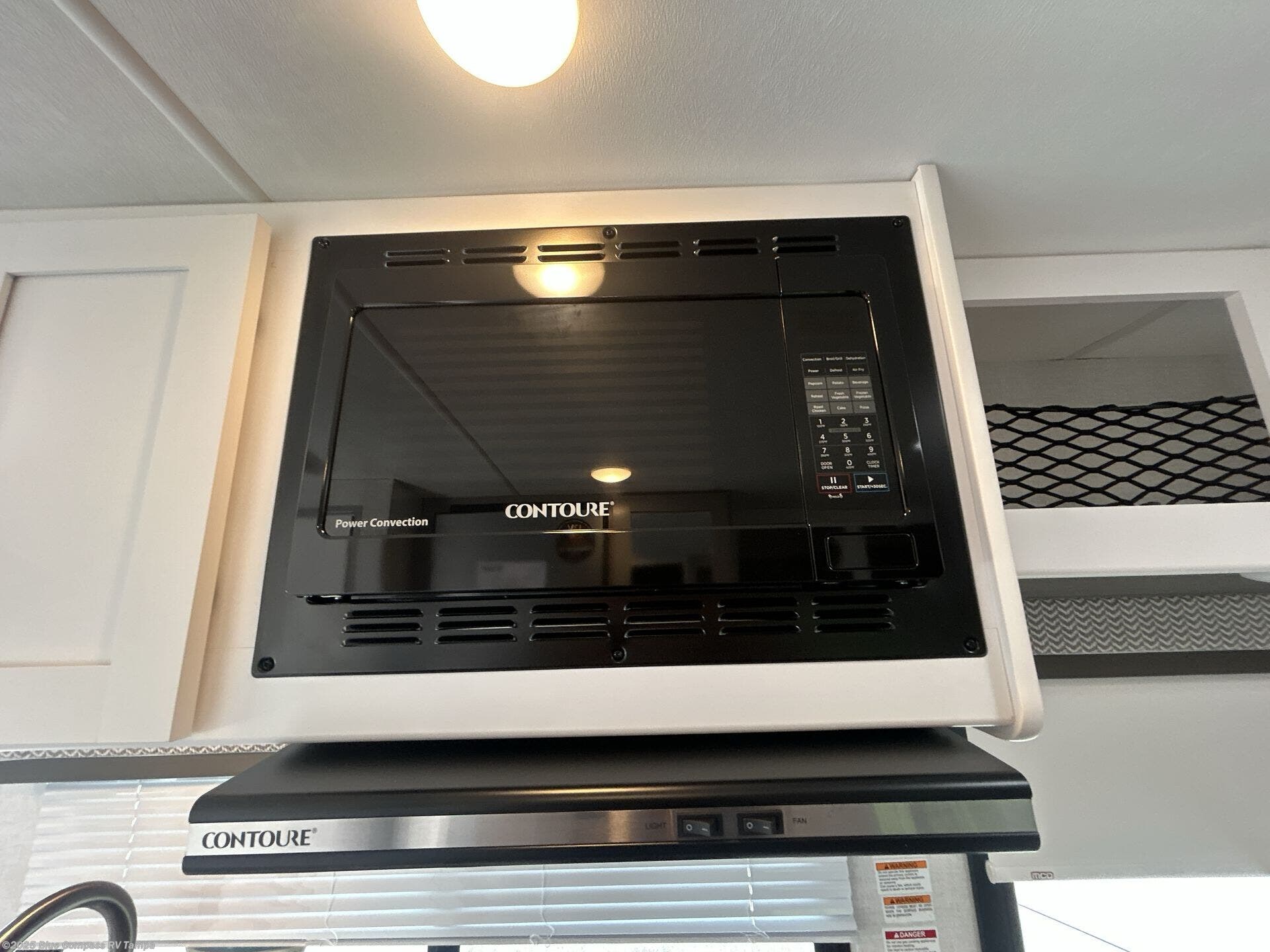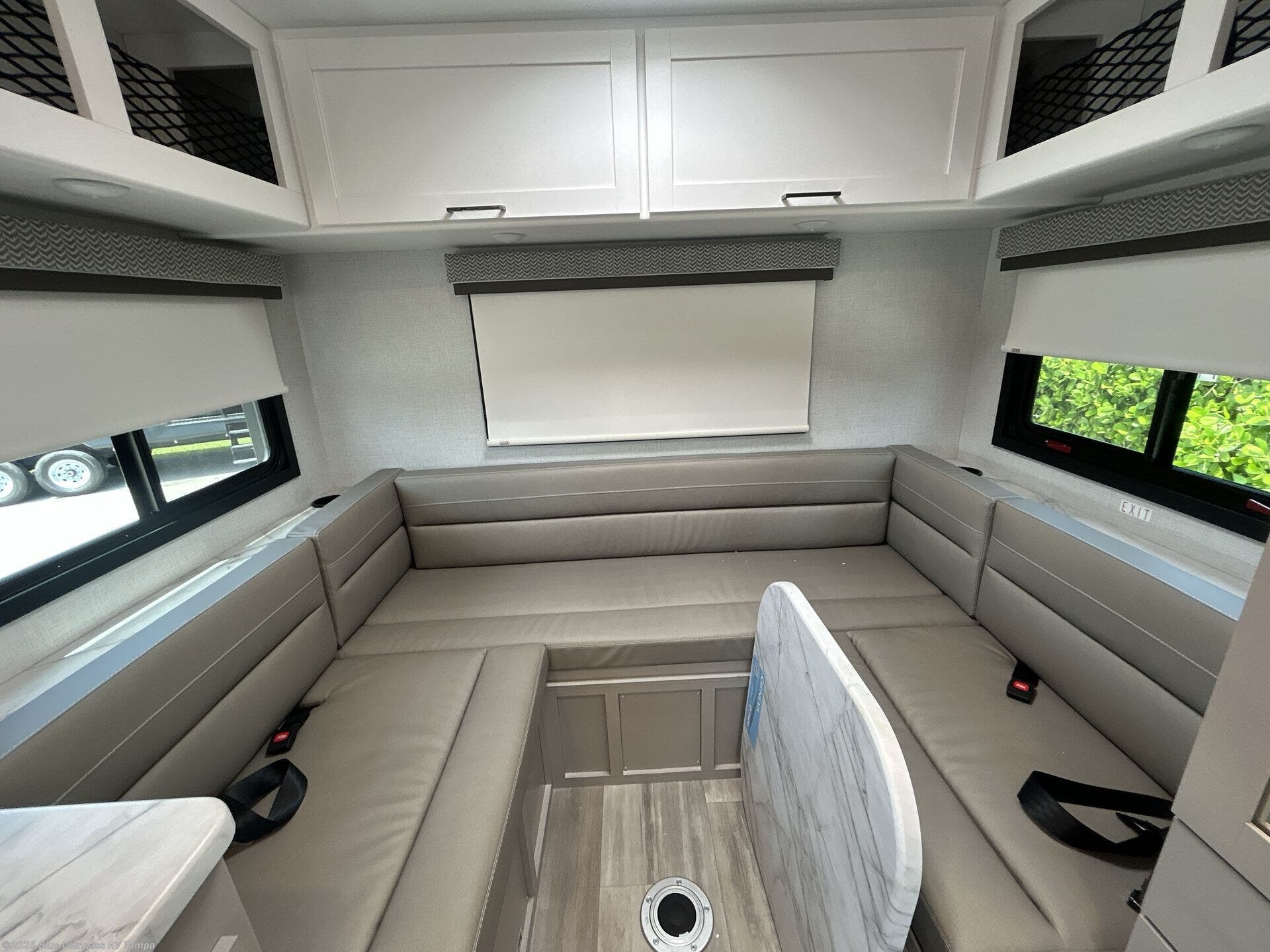 This cozy coach is perfect for three to four happy campers! Once you stop for the day, you can freshen up in the wet bath that includes a foot flush toilet, power vent, and shower skylight for more natural lighting. The two burner cooktop and convection microwave with an air fryer will let you make meals each day, and the 12V refrigerator will keep your food fresh. You'll also appreciate the flip-up countertop for more space to prep meals. There is a U-shaped dinette with a removable table that will convert to a 54" x 77" bed, while the little ones take the cab-over bunk with a 52" x 91" sleeping area.