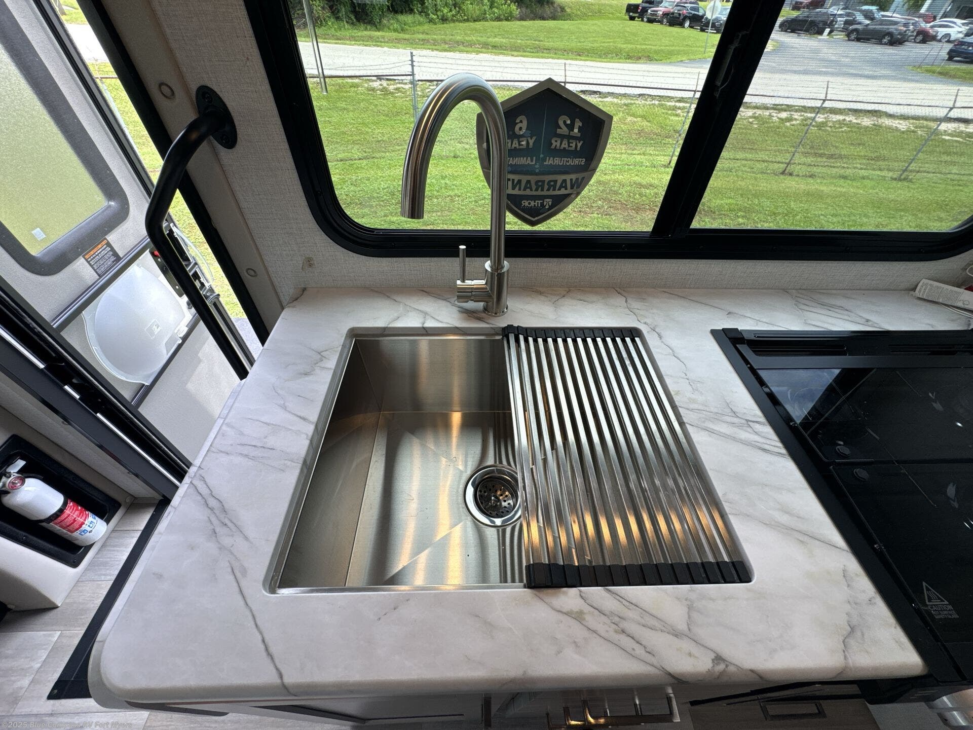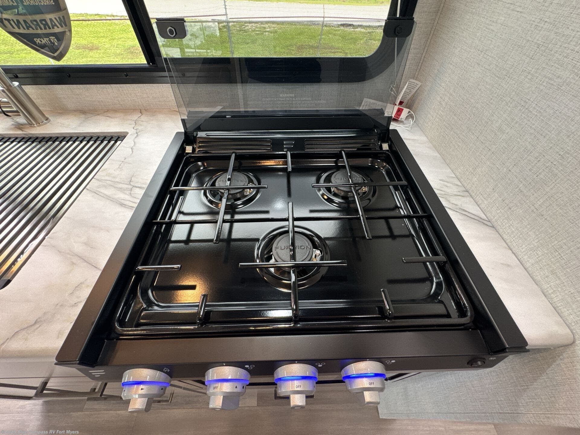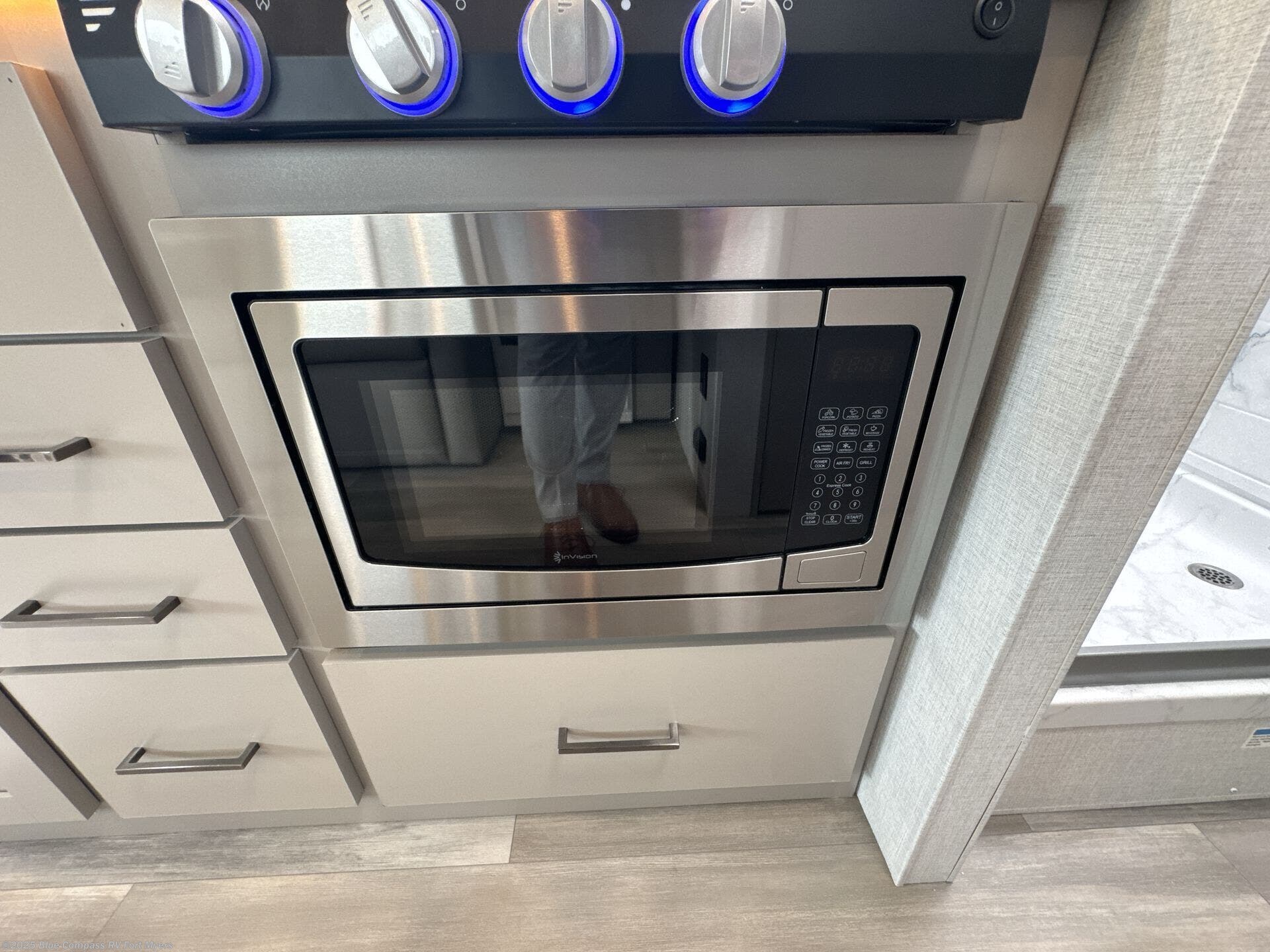 This cozy coach will be perfect for three to four! The rear bedroom includes twin beds with a king bed conversion plus a privacy curtain if you have guests sleeping on the cab-over bunk. A split-style bath features a 24" x 32" shower on one side and a private toilet and sink on the other, allowing two people to use this space at once. Head to the kitchen and prepare breakfast on the three burner gas cooktop or in the convection microwave with an air fryer. There is also a flip-up countertop to give you more space, and the theater seating will give you a place to relax in the evenings!