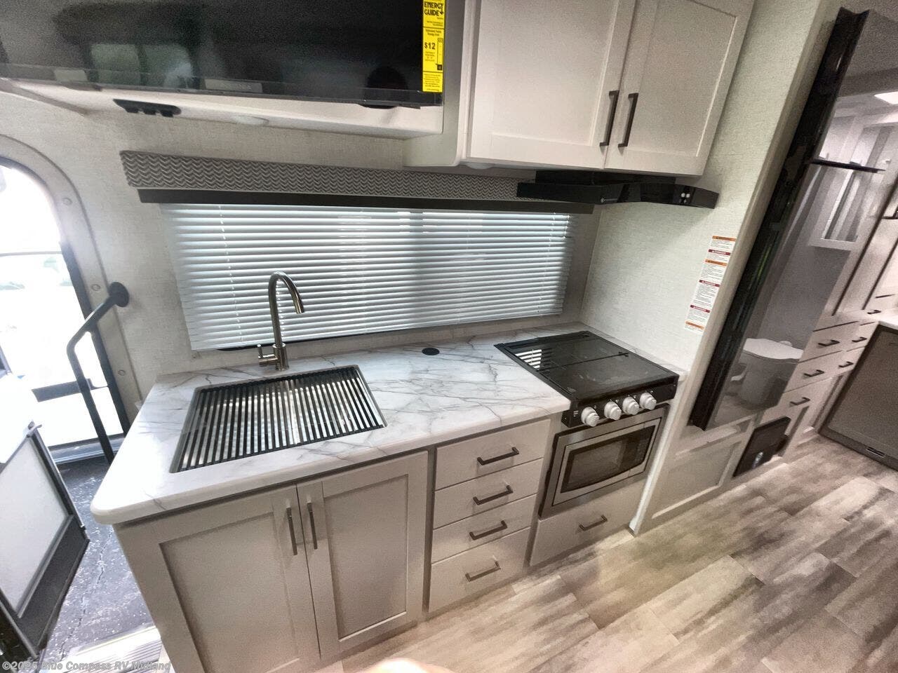 You'll love this versatile coach that features a full-wall slide for added space. The dream dinette and sofa with a Murphy bed is found here so you can enjoy comfy seating and sleeping spaces. There is also a 32" smart TV in the living area plus a privacy curtain around the bed if you have guests staying over on the cab-over bunk. A full rear bath includes a 24" x 36" shower to freshen up, along with a skylight, foot flush toilet and convenient robe hook(s). When you've worked up an appetite, the full kitchen with a three burner gas cooktop and convection microwave will let you make your best meals!