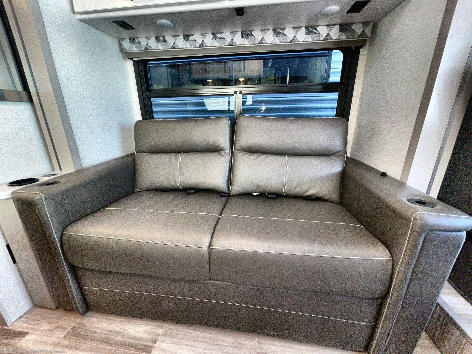 Since this coach features twin beds with a king bed conversion, you can travel with your friend or honey! Along with the versatile sleeping arrangements, you'll also enjoy the bedroom 32" LED Smart TV, and if you have any guests, they can sleep on the 66" sofa bed in the main living room. If you're needing additional sleeping space, just choose the optional power drop-down overhead bunk! A full kitchen includes a two burner gas cooktop and convection microwave with an air fryer, along with a 12V DC double door refrigerator for food storage. The full bath with a 27" x 27" radius shower will let you freshen up each day, and the closet right across the hall will be perfect for clean clothes!