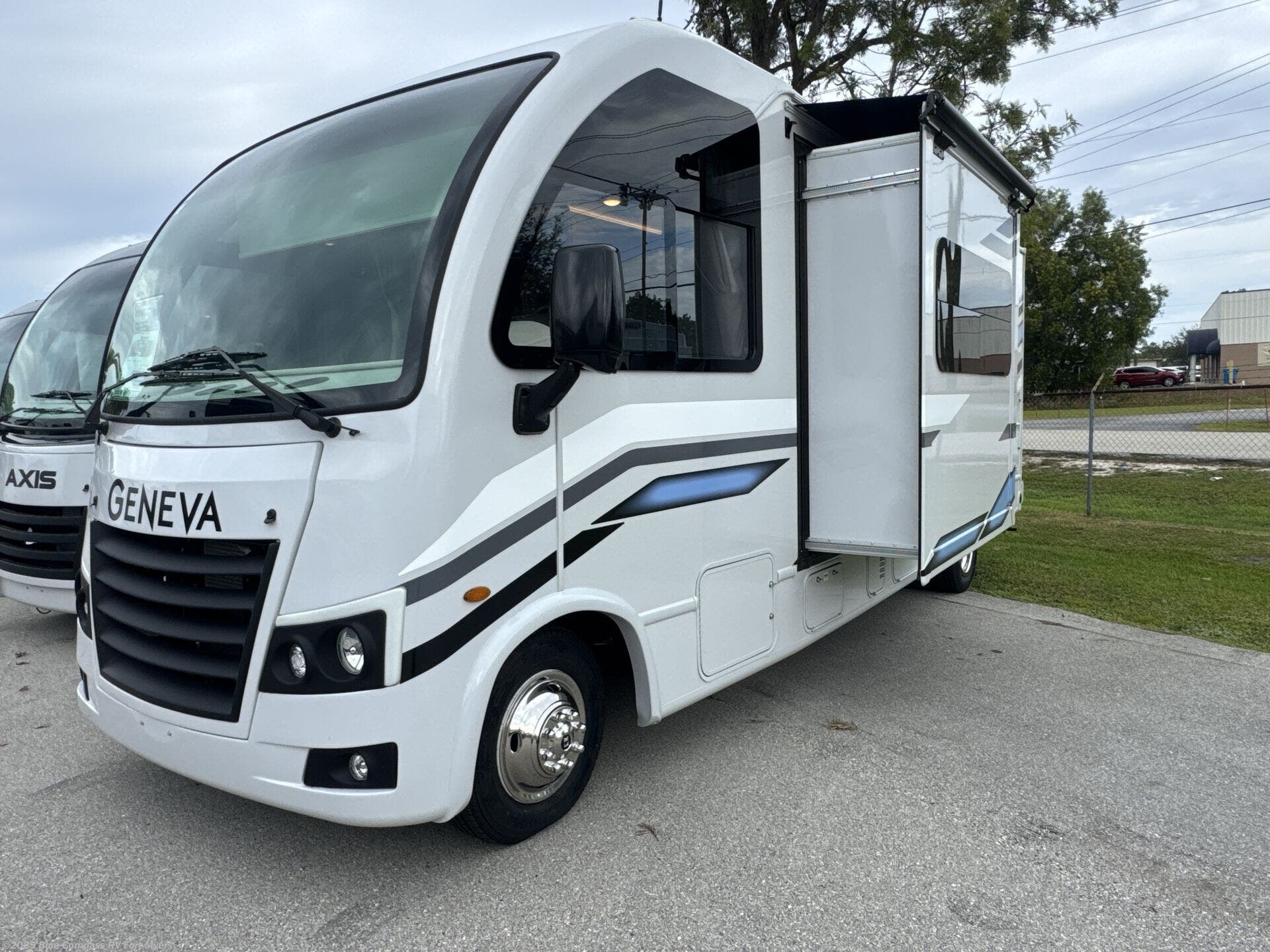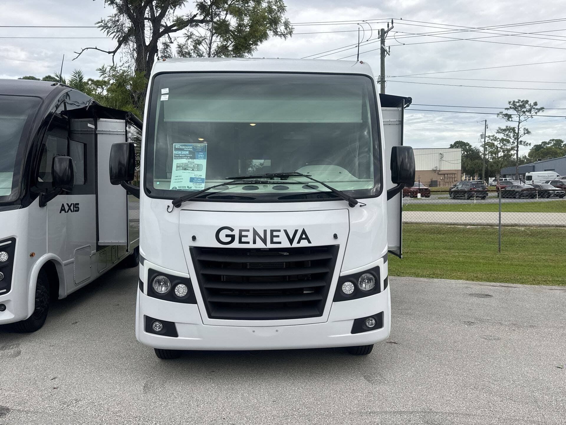The Geneva Class A gas motorhome by Thor Motor Coach is easy to maneuver and even easier to love! There is a durable Ford E-Series chassis with a 7.3L V8 engine to power your trips both near and far. The durable construction includes a welded tubular steel floor, a one-piece fiberglass front cap, plus welded tubular aluminum roof and sidewall cage construction. And the driver is sure to appreciate the 14" touchscreen dash radio, back-up monitor, and reclining/swivel leatherette captain's chairs! Inside, you'll be met with residential vinyl flooring, a designer headboard and pillow shams, a shower skylight, and many more at-home comforts!