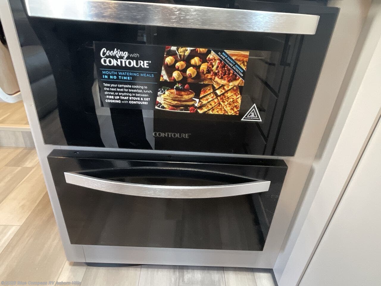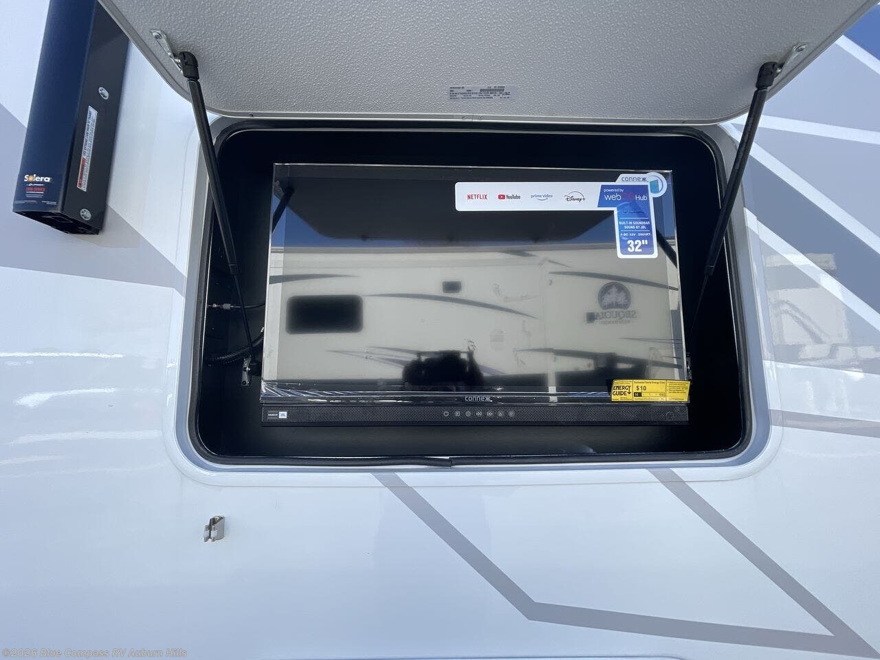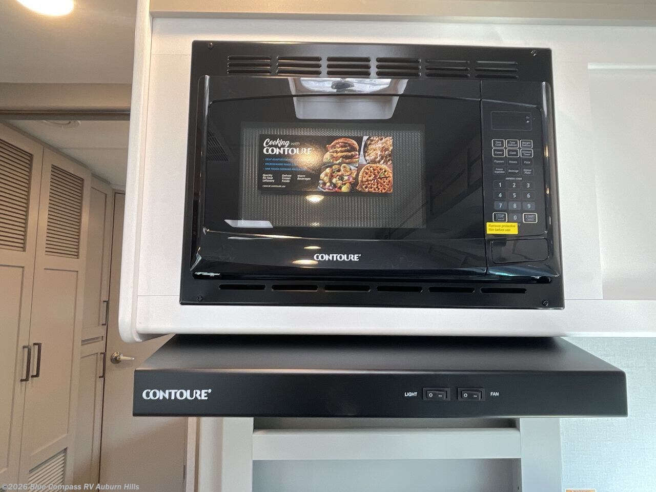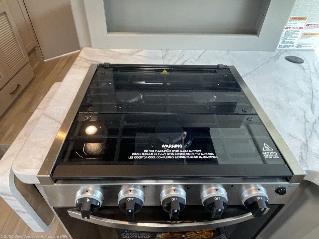 Enjoy a private bedroom with a king bed, large closet, and TV prep! The bathroom is also located in the rear corner for additional privacy. Abundant storage includes a linen closet plus an area prepped for a washer/dryer so you can do your laundry on the road if you choose. Relax on the theater seats while watching the Smart TV. You'll also appreciate the additional 52" x 96" sleeping area in the cab-over bunk so you can bring along guests. The kitchen is fully equipped with a three-burner cooktop, refrigerator, microwave, and flip-up countertop for extra prep space, and a roomy 70" dream dinette is the perfect place to enjoy your meals. Outside you will enjoy watching the exterior TV under the power awning.